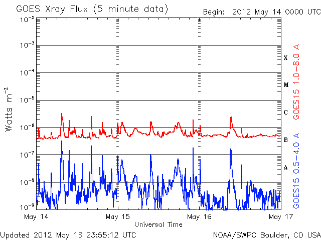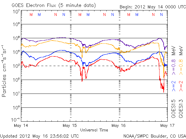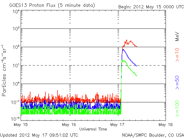 (c) NOAA/SWPC ![]() GOES衛星の太陽X線データ (c) NOAA/SWPC ![]() 2012/ 5/17 18:54 追加 GOES-15のX線カメラによる1476黒点群のM5.1フレアと、CMEの様子(SOHO衛星LASCO C2、C3)。 (c) NOAA/SWPC 、SOHO (ESA & NASA)、(動画加工 : 宇宙天気ニュース) ![]() GOES衛星の太陽X線データ (c) NOAA/SWPC ![]() GOES衛星の太陽放射線データ (c) NOAA/SWPC ![]() 27日の太陽周期に合わせたデータプロット 太陽が同じ面を地球に向けていた27日前の変化から、今後を予想することができます。 (c) 作図:宇宙天気ニュース