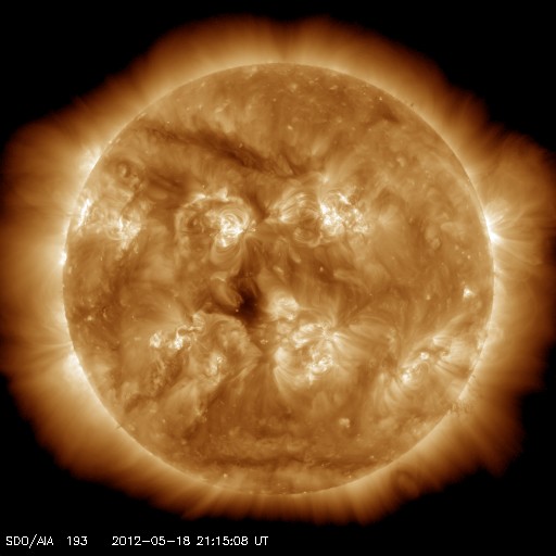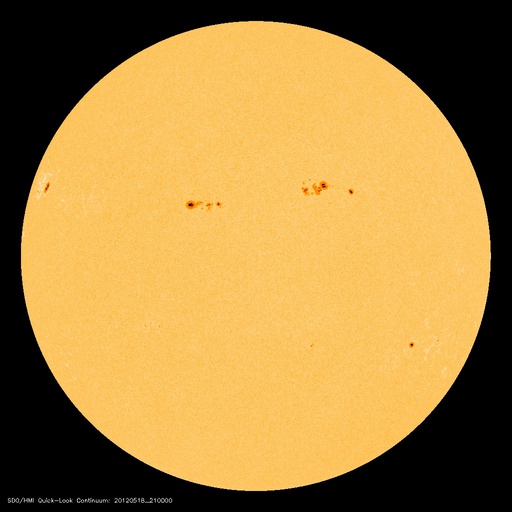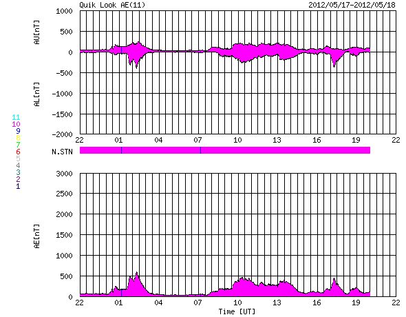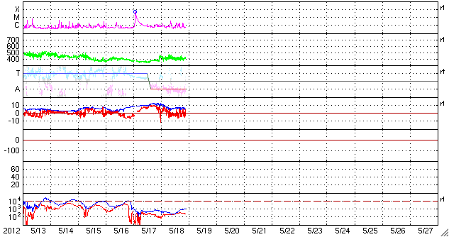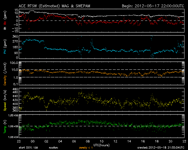 2012/ 5/19 06:57 更新 1476黒点群は見えなくなりました。太陽風は平均的な状態です。 担当 篠原 1476黒点群は太陽の西側に回り込み、見えなくなりました。 GOES衛星のX線動画によると、没した向こう側でフレアの活動を続けていて、 X線グラフのCクラスの活動は、1476群によって起こされている様です。 一方、太陽面には、1482、1484群など、いくつもの黒点が見えていますが、 現在は、あまり活動的ではないようです。 太陽は、しばらく穏やかになるかもしれません。 M5フレアに伴って増加していた高エネルギーの陽子は、 ゆっくりと減少を続けています。 ちょうど警戒レベルの破線を下回った頃です。 太陽風は、420km/秒と平均的な速度が続いています。 磁場強度はゆっくりと下がって、5nTとこちらも平均的な状態です。 磁場の南北成分は、弱い南向きが続いています。 このため、AE指数で300〜500nTの小規模のオーロラ活動が発生している様です。 今日は昭和基地のページが止まっていて、見ることはできませんでした。 太陽風は、基本的には穏やかな風が続くと思われます。 一方、M5.1フレアに伴って発生したCMEの影響が、 今日か明日くらいにやって来るかもしれません。 噴き出したCMEの端の方が当たるくらいなので、変化は小さいでしょう。 ACEの太陽風のグラフを見ながら、到来を待ってみて下さい。 ![]() SDO衛星のAIA193カメラによる太陽コロナの様子 (c) SDO (NASA) ![]() SDO衛星による太陽の可視光写真。マウスの矢印を写真に重ねると、黒点番号付きの写真に切り替わります。 (c) SDO (NASA) ![]() GOES衛星の太陽X線データ (c) NOAA/SWPC ![]() GOES衛星の太陽放射線データ (c) NOAA/SWPC ![]() ACEが観測した太陽風の磁場(1番上の枠、白線は全体の強度、赤線は南北成分) および、太陽風の密度(3番目の橙線)、速度(4番目の黄線) (c) NOAA/SWPC ![]() リアルタイムAE指数 下段のAEグラフの値が高くなると、オーロラ活動が活発化しています。 (c) 京都大学, NICT ![]() 27日の太陽周期に合わせたデータプロット 太陽が同じ面を地球に向けていた27日前の変化から、今後を予想することができます。 (c) 作図:宇宙天気ニュース