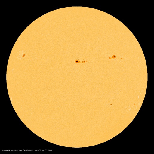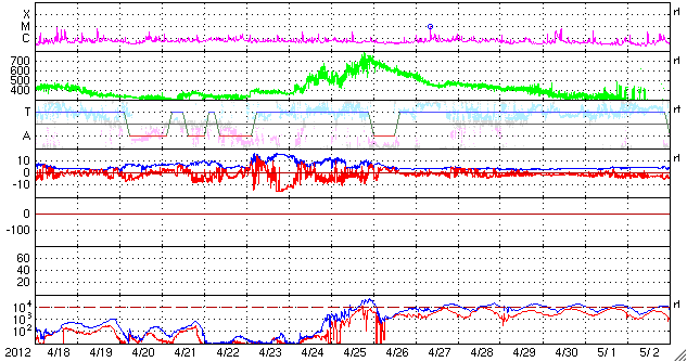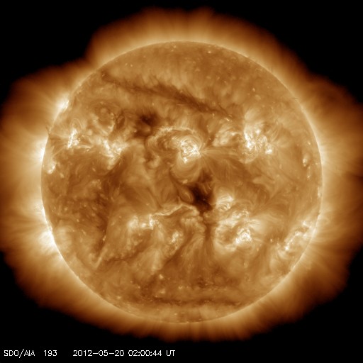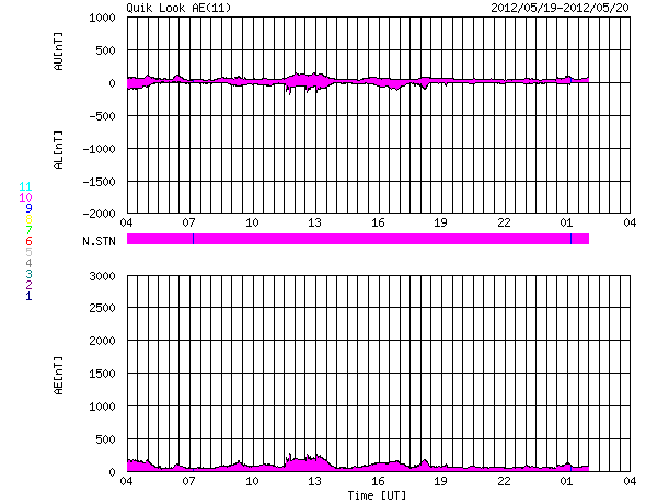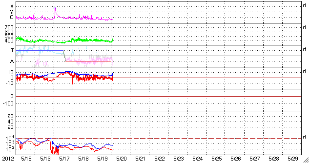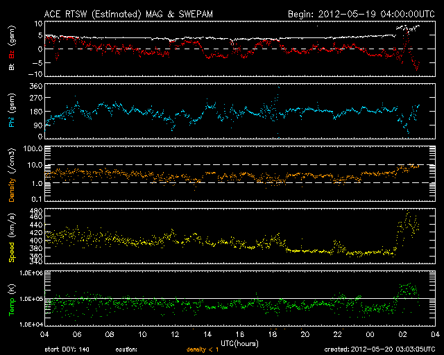 2012/ 5/20 12:04 更新 太陽風の弱い乱れが到来しました。太陽のフレア活動は穏やかです。 担当 篠原 17日のM5.1フレアに伴って発生した太陽風の乱れが、地球に到来しました。 20日10時半(世界時20日1時半)頃に、 ACE衛星の太陽風データに小規模の変動が発生しています。 太陽風の速度は、370km/秒から440km/秒に、 磁場強度は、5nTから8nTに、それぞれ小幅ですが急に強まっています。 地上へは、1時間ほど遅れて変化が来ています。 太陽風の変化が小さいので、影響は小さそうです。 ただ、ACEの最新のデータでは、太陽風の磁場が南向き -7nT程度まで強まっています。 この状態が続くと、オーロラ活動の強まりが期待できます。 太陽風は、この乱れが通り過ぎると、再び穏やかな状態が続くでしょう。 SDO衛星AIA193を見ると、太陽の中心部に小さなコロナホールがあります。 3日後くらいに、多少、影響が見られるでしょうか。 太陽は、1476黒点群が没して、 フレアの活動はすっかり弱まっています。 1479黒点群でC1.1、C1.0と小さなCクラスフレアが2回起きていますが、 X線のグラフは変化も少なく、 太陽は全体としては穏やかです。 いよいよ明日、金環日食です。 鹿児島の天気予報はかなり厳しく、今日は朝から雨が降っていました。 今後回復することを願っていますが、みなさんの地域はいかがでしょうか。 安全に配慮して、日食をお楽しみ下さい。