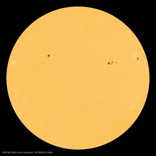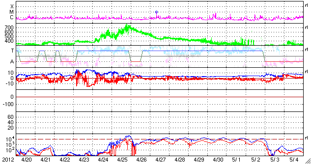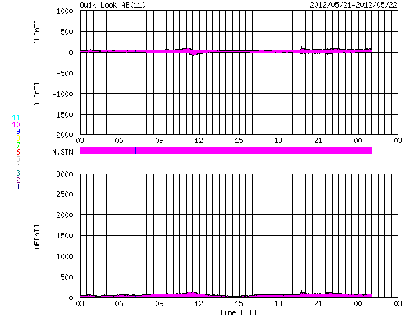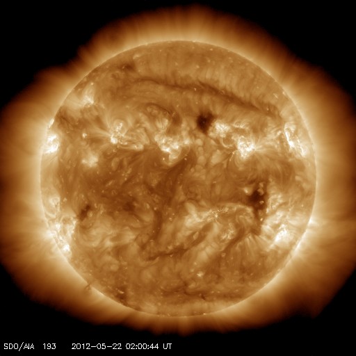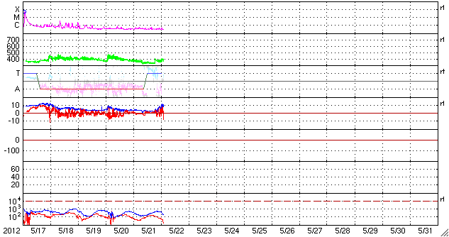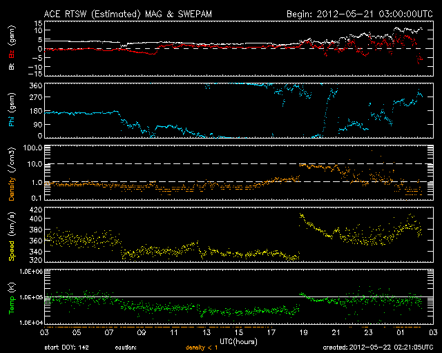 2012/ 5/22 11:22 更新 太陽風に小さな乱れが到来しています。磁気圏は静穏です。 担当 篠原 太陽風は、再び小さな乱れが到来しています。 ACE衛星の観測によると、今日の未明、22日3時半(世界時21日18時半)頃、 太陽風の速度(ACEの図の黄色線)が330km/秒から400km/秒に上がり、 プラズマの密度(橙色線)も1個/cm^3から10個/cm^3に増加する変動がやって来ました。 変化の様子から、CMEなどの影響が到来したのかもしれません。 速度の高まりは、平均的なレベルに達した程度で、変化としては小さなものです。 太陽風の磁場強度(白線)は、乱れの到来時はほとんど変化しなかったのですが、 その後ゆっくりと強まり、現在は10nTで落ち着いています。 磁場の南北成分(赤線)は、今のところは北寄り(プラス側)に変化しています。 このため、磁気圏の活動は小さく、AE指数のグラフはほとんど変化していません。 しかし、磁場強度が強まっているので、 今後、南北成分が南寄り(マイナス側)に切り替わるなどすると、 磁気圏へのエネルギーの流れ込みが強まり、 オーロラの活動がある程度強まることになるでしょう。 SDO衛星AIA193の太陽コロナ写真を見ると、 赤道の小さなコロナホールが西側に半分ほど移動しています。 地球へ影響が及び始める目安の位置です。 今後、太陽風に弱い乱れをもたらす可能性があります。 現在の磁場強度の強まりは、こちらと関係しているのかもしれません。 GOES衛星のX線グラフでは、目立ったフレア活動は記録されていません。 可視光写真の黒点の見え方も小さくなっている印象で、 太陽の活動は、このまま穏やかに推移しそうです。