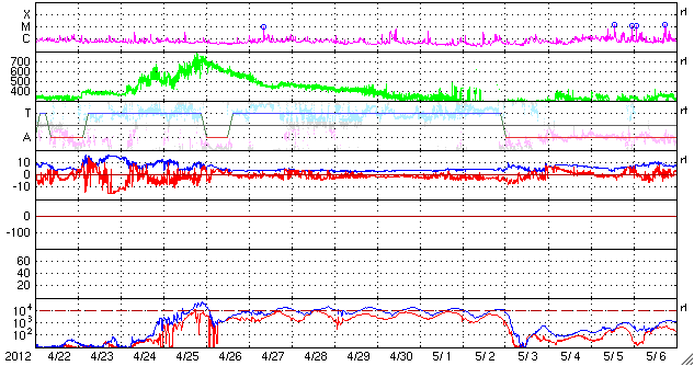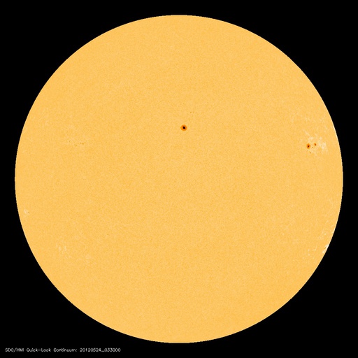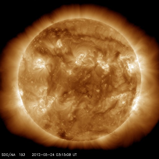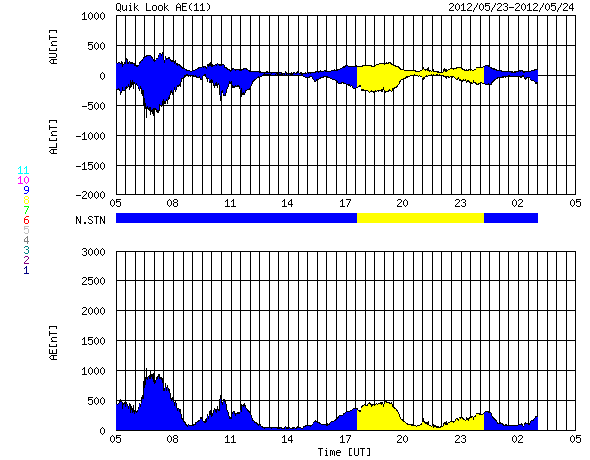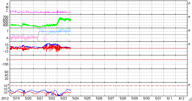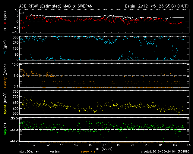 2012/ 5/24 13:12 更新 太陽風は600km/秒台の高速風になっています。オーロラの活動も強まりました。 担当 篠原 昨日のニュースの後も、太陽風の速度は上昇を続け、 昼過ぎの23日13時(世界時23日4時)には、 600km/秒を超えるまでに上がりました。 ここまで高速風になることは、予想していませんでした。 あまり目立たないコロナホールでしたが、太陽風の吹き出しは強かった様です。 太陽風の速度はその後も600km/秒前後と高速の状態を保っています。 一方、太陽風の磁場強度は、速度の上昇とともに弱まり、 速度が上がり切る頃には5nTに、そして、現在は3nTに弱まっています。 この影響で、オーロラの活動も高まり、 AE指数で1000nTから500nTの変化が何度も発生しています。 AE指数のグラフでは、太陽風磁場が強まっていた前半により大きな変化が発生し、 磁場が弱まってきた後半は次第に小さくなっています。 太陽風の磁場強度が下がってきたことから、 高速風は後半に入っていると思われます。 この後は、次第に低下に向かいそうです。 太陽は、X線のグラフに特に変動はなく、活動は落ち着いています。 黒点も2つの群が目立っている程度です。 ![]() SDO衛星のAIA193カメラによる太陽コロナの様子 (c) SDO (NASA) ![]() SDO衛星による太陽の可視光写真。マウスの矢印を写真に重ねると、黒点番号付きの写真に切り替わります。 (c) SDO (NASA) ![]() ACEが観測した太陽風の磁場(1番上の枠、白線は全体の強度、赤線は南北成分) および、太陽風の密度(3番目の橙線)、速度(4番目の黄線) (c) NOAA/SWPC ![]() リアルタイムAE指数 下段のAEグラフの値が高くなると、オーロラ活動が活発化しています。 (c) 京都大学, NICT ![]() 27日の太陽周期に合わせたデータプロット 太陽が同じ面を地球に向けていた27日前の変化から、今後を予想することができます。 (c) 作図:宇宙天気ニュース