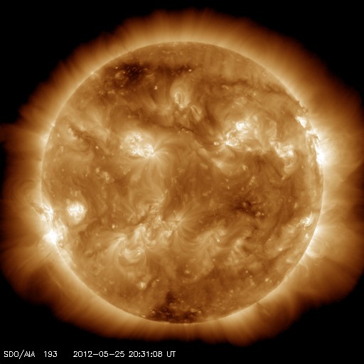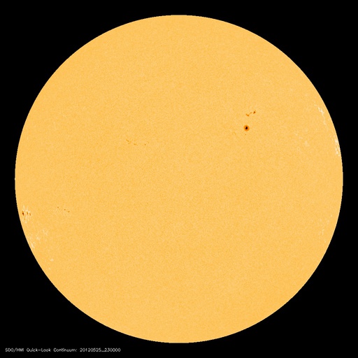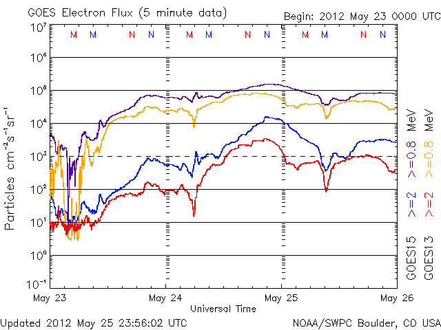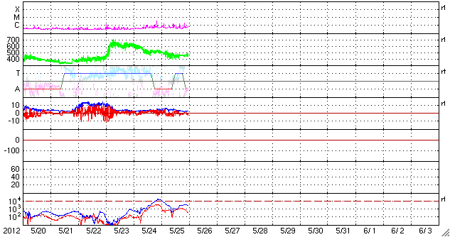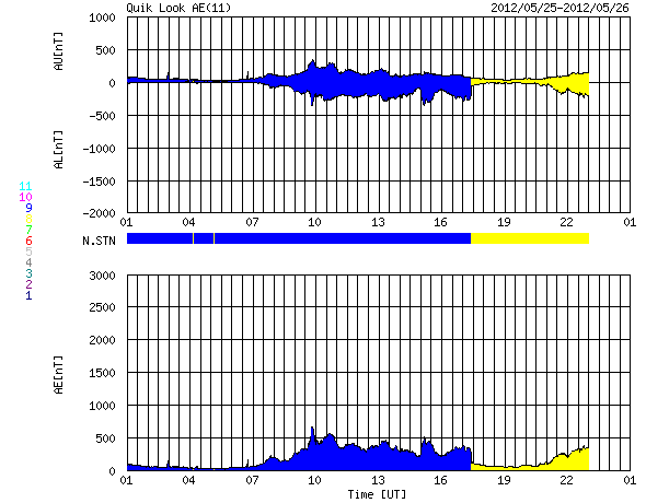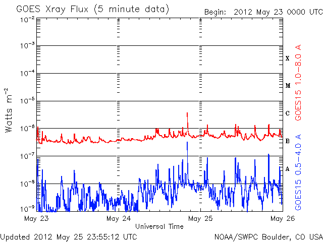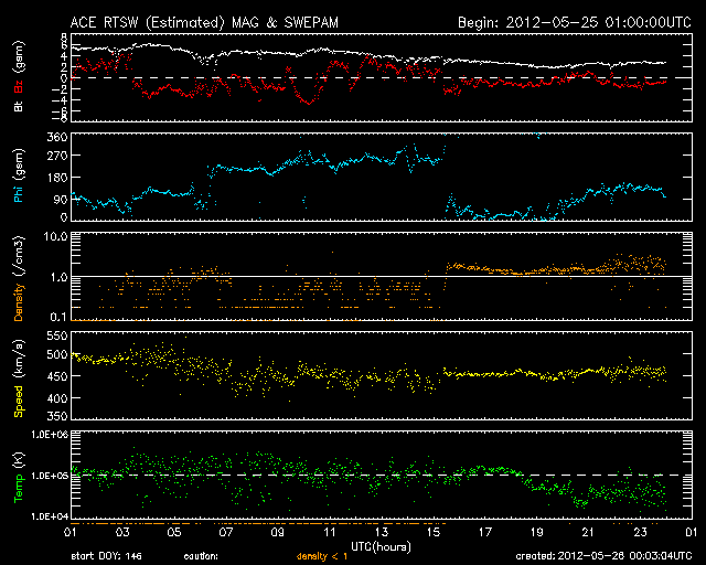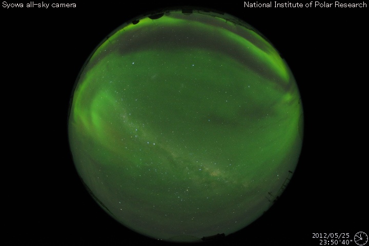 2012/ 5/26 09:04 更新 C1の小さなフレアが頻繁に発生しています。高速の太陽風は終わりつつあります。 担当 篠原 太陽で、C1程度の小さな小規模フレアが頻繁に発生しています。 その多くは、太陽の南東の端で起きています。 今日の可視光写真では、この部分から1492黒点群が顔を出しました。 今のところ、活動の規模としては小さなものばかりですが、 ここから更に発達するのかどうか、注目して下さい。 その他にも、1491黒点群が新しく発生したり(昨日の写真に既に写っていました)、 黒点の発生はある程度活発に続いています。 太陽風は、昨夜のうちに速度が500km/秒から450km/秒に下がり、 高速風は終わりつつあります。 太陽風の磁場強度も、5nTから3nTに弱まっています。 太陽風はひとまず穏やかな状態になりそうです。 一方、太陽風磁場の南北成分は、振れ幅は弱いものの、南寄りになっています。 このため、オーロラの活動も小規模ですが活発化して、 AE指数のグラフは500nT弱の変化が長い時間続いています。 昭和基地の1枚を紹介しましょう。 オーロラの淡い光が全天を覆い、その向こうを天の川が斜めに流れています。 この後、太陽風は穏やかな状態が続きそうですが、 昨日紹介した様に、淡いコロナホールの影響が見られるかもしれません。 放射線帯の高エネルギー電子の数は減少しています。