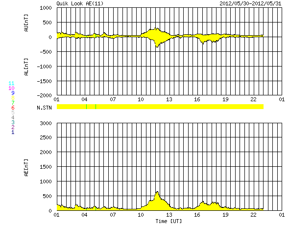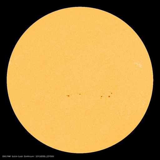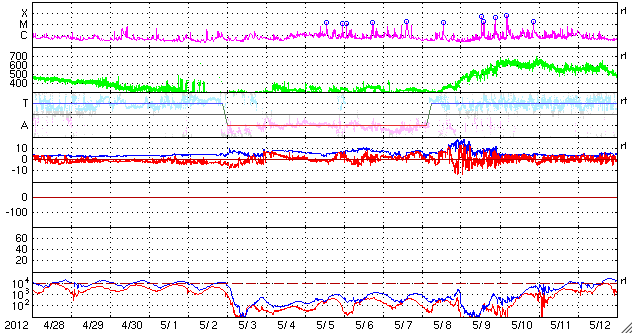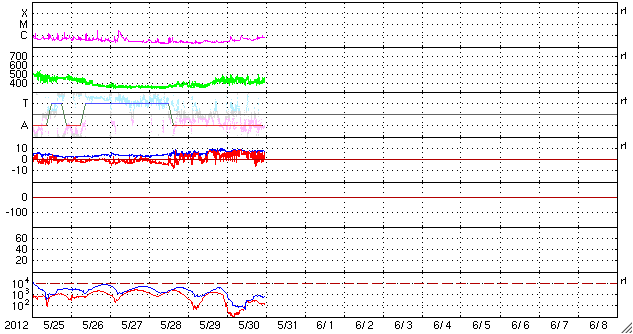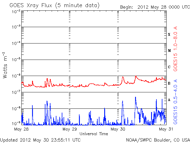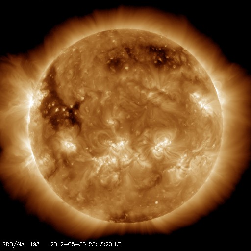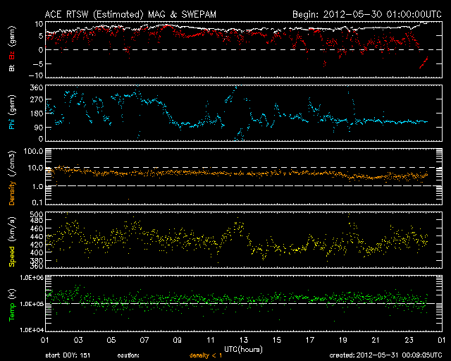2012/ 5/31 09:10 更新 太陽風は平均的な速度です。コロナホールの大きな広がりが見えてきました。 担当 篠原 GOES衛星のX線グラフの強度が少し高まってきました。 太陽の東端の向こう側にある活動領域が、 こちらに近づいているためだと思います(1枚目の写真)。 どの様な領域が現われるのか注目してください。 太陽では、特に目立った活動はなく、穏やかな状態が続いています。 太陽風は、400〜440km/秒と平均的な速度が安定して続いています。 磁場強度も、8nT前後とやや強まった状態ですが、安定しています。 27日周期の図によると、 速度は少し上がっていますが、前周期の変化とよく似た状態です。 コロナホールの影響が始まるまで、このままの状態が続くのかもしれません。 そのコロナホールは、SDO衛星AIA193の写真で少しずつ姿を現しています。 今日の写真では、東側の半分ほどにまで進んでいます。 今後、太陽の中心まで3日、高速風の到来にもう3日程度と見積もると、 6月6日前後に影響が始まると予想できそうです。 磁気圏は、小中規模の活動が2〜3回発生していますが、 比較的穏やかな状態です。 ただし、太陽風磁場の強度がやや強まっているので、 南北成分が南向きに大きく振れるなどして、 磁気圏の活動を強める可能性があります。