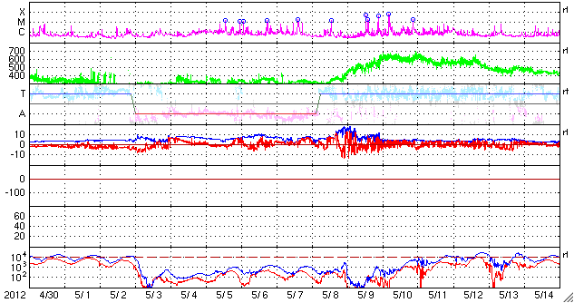 (c) SDO (NASA)、 (動画加工 : 宇宙天気ニュース) ![]() SDO衛星のAIA193カメラによる太陽コロナの様子 (c) SDO (NASA) ![]() SDO衛星による太陽の可視光写真。マウスの矢印を写真に重ねると、黒点番号付きの写真に切り替わります。 (c) SDO (NASA) ![]() GOES衛星の太陽X線データ (c) NOAA/SWPC ![]() ACEが観測した太陽風の磁場(1番上の枠、白線は全体の強度、赤線は南北成分) および、太陽風の密度(3番目の橙線)、速度(4番目の黄線) (c) NOAA/SWPC ![]() リアルタイムAE指数 下段のAEグラフの値が高くなると、オーロラ活動が活発化しています。 (c) 京都大学, NICT ![]() 27日の太陽周期に合わせたデータプロット 太陽が同じ面を地球に向けていた27日前の変化から、今後を予想することができます。 (c) 作図:宇宙天気ニュース