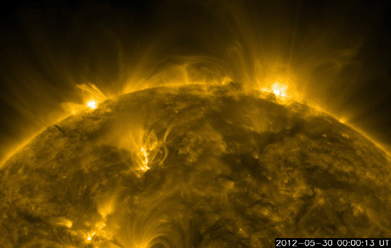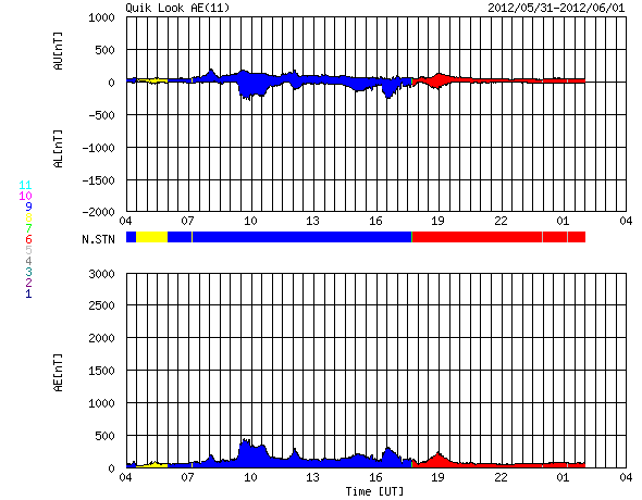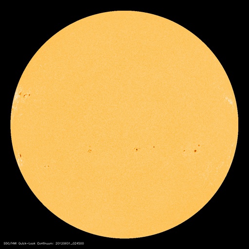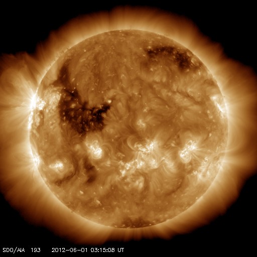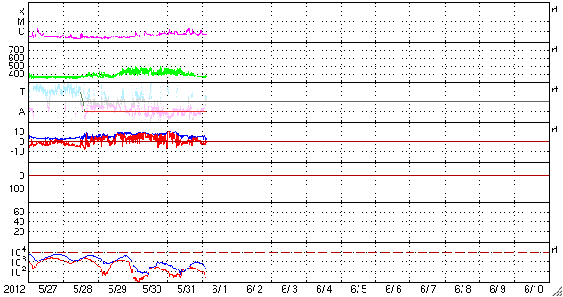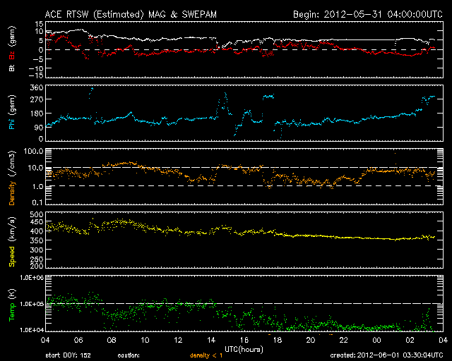 2012/ 6/ 1 12:30 更新 太陽の東から新しい黒点群が上がってきました。太陽風の速度は下がり、低速風になっています。 担当 篠原 太陽の東端から、南北両半球にセットで新しい黒点群が上がってきました。 北半球は1493黒点群、南半球は1494黒点群と番号が付けられています。 こちら側に回り込んでくる様子を、SDO衛星AIA171の動画で紹介します。 写真を90度回転させて、地平線の向こうからやって来るような動画にしています。 早速、昨夜より、C2.2、C2.5など、Cクラスのフレアを頻繁に起こしています。 今後の活動に注目してください。 太陽風は、速度がゆっくりと下がって、360km/秒と低速風に変わっています。 磁場強度も5nTと平均的な強度に下がっています。 2〜3日ほど続いていた、太陽風の弱い高まりは終わった様です。 磁気圏も基本的に穏やかで、 AE指数のグラフは、200nT、400nTなどの小規模の変化が発生している程度です。 今後の太陽風の乱れの原因となるコロナホールは、 太陽の中心に少しずつ近づいています。 SDO衛星AIA193のコロナ写真を見て下さい。 薄暗いコロナホールの先頭(左端)は、 明日くらいに太陽の中央線に届きそうです。 コロナホールの濃さや広がりは大きく、 来週には、まとまった高速太陽風が地球にやって来そうです。