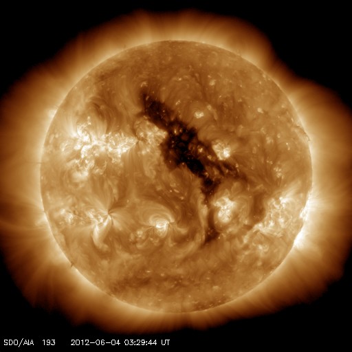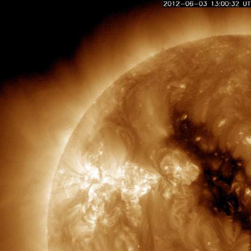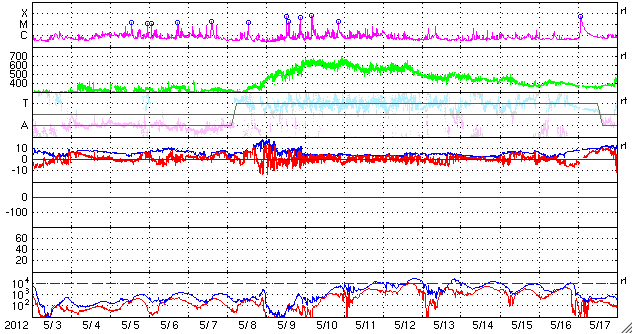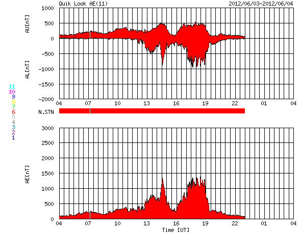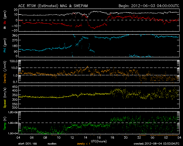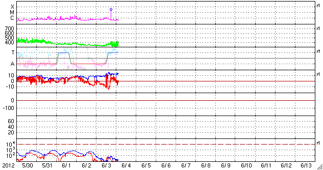 2012/ 6/ 4 12:54 更新 太陽風磁場が南向きに強まり、磁気圏の活動が強まりました。Mクラスのフレアも発生しています。 担当 篠原 昨日の午後(日本時間)より、太陽風磁場の南北成分は再び大きく南を向き始め、 およそ半日にわたって -5nTから-15nTに達する強い南向きが続きました。 この間、太陽風の速度は350km/秒と低速の状態が続きましたが、 AE指数では、1300nTに達する大きな変動が発生しています。 更に、AE指数の図の上のグラフを見ると、 0nTをはさんでマイナス側(下側)のAL指数の大きな変化とともに、 プラス側(上側)のAU指数も500nTに大きく変化しています。 太陽風磁場の強い南向きが長い時間続いたことで、 大きなエネルギーが太陽風から地球の磁気圏に流れ込んでいた様です。 太陽風の磁場は、今日に入った頃に強い南向きが終わり、 その後は0nT付近で推移しています。 それとともに、磁気圏の活動も弱まり、 AE指数のグラフの右端は、変化が小さくなっています。 太陽では、深夜、4日3時(世界時3日18時)に、 1496黒点群でM3.3の中規模フレアが発生しました。 Mクラスのフレアは、5月17日以来、半月ぶりです。 X線グラフの変化はとても短時間ですが、 SDO衛星AIA193の動画を見ると、コロナの噴き上がりが発生しています。 SOHO衛星LASCO C2カメラは、途中で写真が途切れていますが、 CMEが噴き出すところまで見えています。 左上に向かっていますが、 地球へもある程度影響がやって来るかもしれません。 SDO衛星AIA193を見ると、コロナホールが太陽の中心を越えて、 西側に迫り出しています。 そろそろ高速風が到来しそうです。 現在の太陽風磁場の強まりは、このまま高速風の変化につながりそうです。 さて、明後日、6日(水)の金星の日面通過についてです。 台風が近づいていることもあり、当日の天候が心配です。 それでも、宇宙天気で普段使っているリアルタイムデータを使うと、 天候に関わりなくほぼ同時に現象を見ることができます。 GOES衛星のX線写真 野辺山太陽電波観測所の電波ヘリオグラフ SDO衛星のAIA193やAIA304、可視光写真 などです。 どの様に見えるかは、前回の日面通過が起きた、 2004年6月8日の翌日の記事をご覧ください。