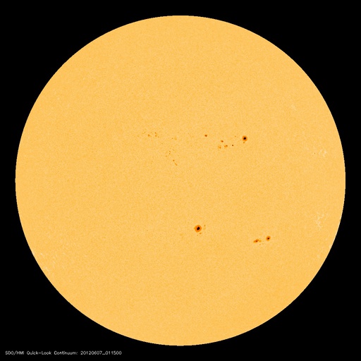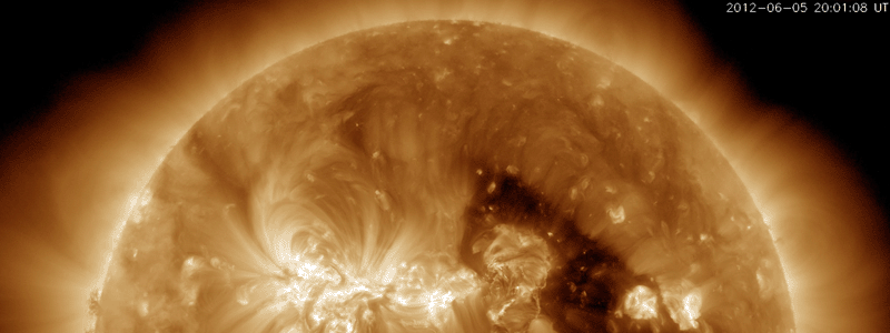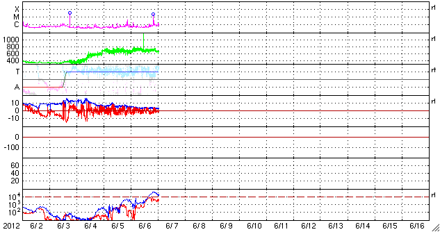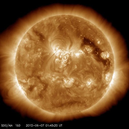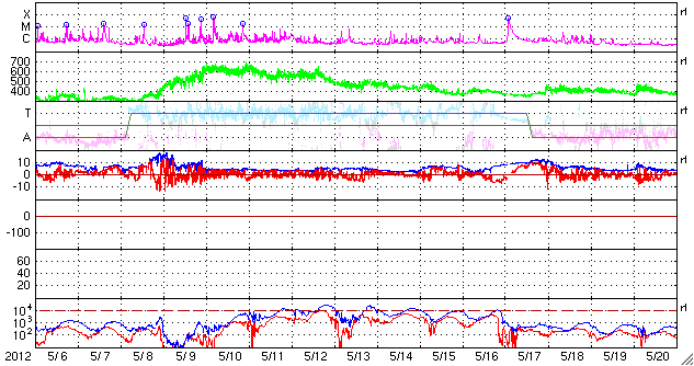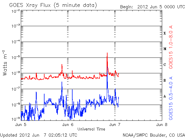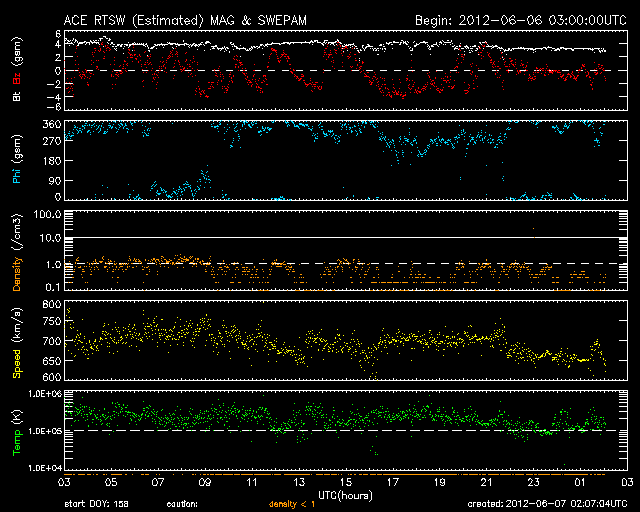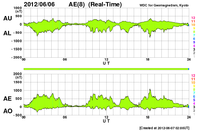 2012/ 6/ 7 11:07 更新 M2の中規模フレアが発生しました。太陽風は高速ですが、650km/秒と下がりつつあります。 担当 篠原 昨日の金星の太陽面通過の様子を、 SDO衛星AIA193と304の動画で紹介します。 もっときれいな動画は、2012 Venus Transit Dataで見ることができます。 「View Movie」をどんどん押してみて下さい。 また、野辺山の電波ヘリオグラフの様子は、こちらのページへどうぞ。 また、SpaceWeather.comでは、各地から寄せられた写真を紹介しています。 日没の太陽に金星の影が重なる写真が印象的です。 さて、その太陽では、 早朝、7日5時(世界時6日20時)にM2.1の中規模フレアが発生しました。 場所は、南半球の中央の1494黒点群です。 太陽面には黒点群はいくつも見えていますが、 特に活動が強まっている様子はなく、 この後も太陽は現状程度の活動を続けそうです。 太陽風は、700km/秒とかなり高い速度が続いていましたが、 ピークは過ぎたようで、現在は650km/秒近くに下がりつつあります。 磁場強度も4nTから3nTへもう一段下がり、 高速風領域は後半に入っていると思われます。 SDO AIA193を見ると、今回の高速太陽風をもたらしたコロナホールは、 太陽の西側へだいぶ回っています。 高速風の影響ももう3日くらいでしょうか。 磁気圏のオーロラは活動的な状態が続いています。 AE指数のグラフは、700nT前後の中規模の活動が頻繁に発生しています。 ACEのグラフで太陽風磁場の南北成分(赤線)を見ると、 -3〜-4nTくらいの南向きによく振れています。 この変化に高速風が重なって活発な活動を起こしたのでしょう。 現在は磁場強度が下がり、速度も低下の傾向を見せているため、 今後は磁気圏の変動も次第に弱くなって行くでしょう。 今回の高速太陽風の影響で、放射線体の高エネルギー電子が大きく増加しています。 GOES15の青線は10,000を超え、GOES13の赤線も迫っています。 ![]() SDO衛星で観測された、金星の太陽面通過。 (c) SDO (NASA)、 (動画加工 : 宇宙天気ニュース) ![]() AU,AL指数とAE,AO指数のグラフ。 (c) 京都大学WDC ![]() SDO衛星のAIA193カメラによる太陽コロナの様子 (c) SDO (NASA) ![]() SDO衛星による太陽の可視光写真。マウスの矢印を写真に重ねると、黒点番号付きの写真に切り替わります。 (c) SDO (NASA) ![]() GOES衛星の太陽X線データ (c) NOAA/SWPC ![]() ACEが観測した太陽風の磁場(1番上の枠、白線は全体の強度、赤線は南北成分) および、太陽風の密度(3番目の橙線)、速度(4番目の黄線) (c) NOAA/SWPC ![]() 27日の太陽周期に合わせたデータプロット 太陽が同じ面を地球に向けていた27日前の変化から、今後を予想することができます。 (c) 作図:宇宙天気ニュース