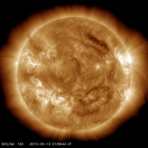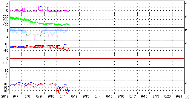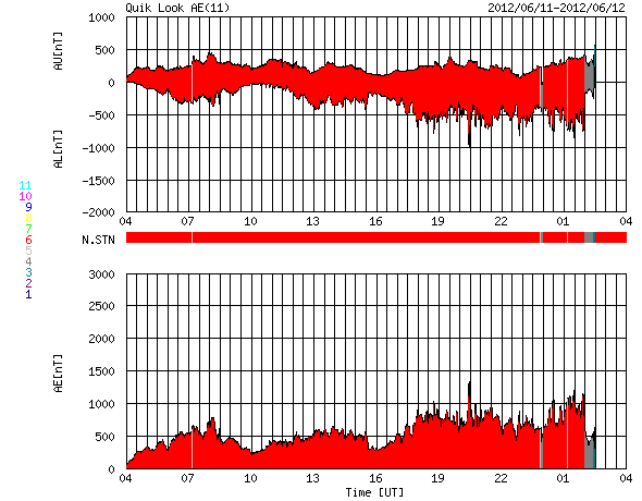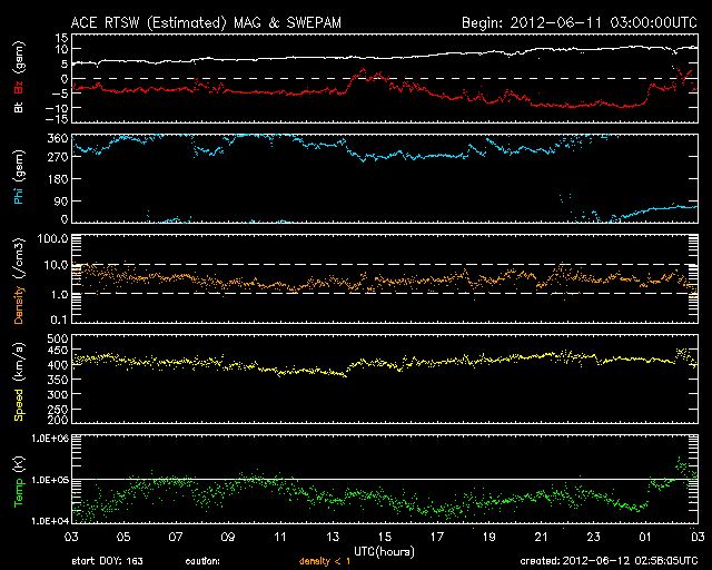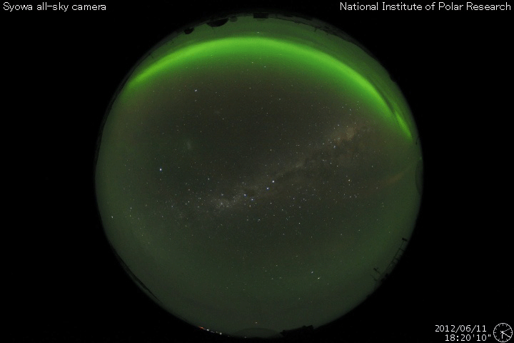 2012/ 6/12 12:00 更新 太陽風磁場が南向きに強まり、磁気圏活動が強まっています。 担当 篠原 太陽風磁場が南向きに振れ続け、活発な磁気圏活動が発生しています。 昨日のニュース以降、太陽風の磁場強度はゆっくりと強まり、 昨日の5nTから、今朝、12日5時(世界時11日20時)頃には10nTに達しました。 その間、磁場の南北成分は安定した南向きが続きました。 -4nTから次第に強まり、 日本時間で今日の早朝には、-10nTまで大きく強まりました。 その間、太陽風の速度は400〜430km/秒と平均的な状態で安定しています。 磁場変化の様子から、7日か8日に太陽で発生したCMEによって、 磁場のかたまりが流れて来たのかもしれません。 この影響で、AE指数は、500nTから1000nTに達する活発な変動が 1日を通して観測されています。 その中の、世界時11日18〜20時の南極・昭和基地のオーロラを動画で紹介します。 途中、激しい輝きが空を右から左に横断していきます。 素晴らしい光景です。 現在の太陽風の磁場は、南北成分が南向きから0nT付近に切り替わっています。 太陽風磁場の大まかな方向が反転しているところの様です。 このため、太陽風の磁場強度の強まりはもうしばらく続くかもしれませんが、 南向きへの偏りは弱まり、その場合は磁気圏変動も規模が小さくなるでしょう。 Dst指数(京都大学WDC)も、今回の太陽風の乱れに関係して、 -60nTの変化を記録しています。 赤道を取り巻く環電流が発達して、小規模の磁気嵐になっているようです。 また、放射線帯の高エネルギー電子は、激しく変動しています。 変動が終わる頃に、大きく強まっている可能性もあるので、 明日のデータに注目してください。 太陽は、1507黒点群でC1台の小さなフレアが頻繁に発生しています。 となりの1504黒点群と共に、黒点の形が変化を続けており、 今後も、小中規模のフレアを起こす可能性があります。 ![]() 南極の昭和基地で、全天カメラにより撮影された活発なオーロラの活動。 (c) 国立極地研究所、(動画加工 : 宇宙天気ニュース) ![]() SDO衛星のAIA193カメラによる太陽コロナの様子 (c) SDO (NASA) ![]() SDO衛星による太陽の可視光写真。マウスの矢印を写真に重ねると、黒点番号付きの写真に切り替わります。 (c) SDO (NASA) ![]() ACEが観測した太陽風の磁場(1番上の枠、白線は全体の強度、赤線は南北成分) および、太陽風の密度(3番目の橙線)、速度(4番目の黄線) (c) NOAA/SWPC ![]() リアルタイムAE指数 下段のAEグラフの値が高くなると、オーロラ活動が活発化しています。 (c) 京都大学, NICT ![]() 27日の太陽周期に合わせたデータプロット 太陽が同じ面を地球に向けていた27日前の変化から、今後を予想することができます。 (c) 作図:宇宙天気ニュース