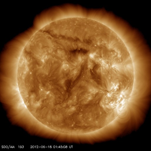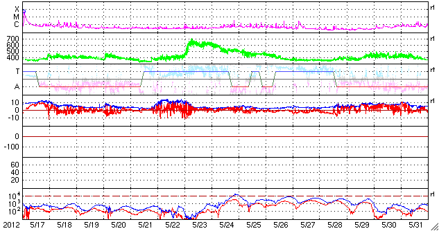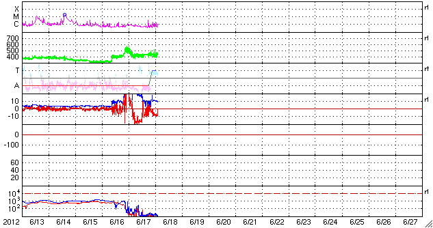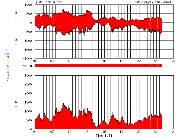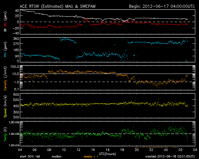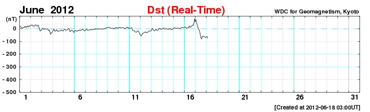 2012/ 6/18 12:01 更新 太陽風の磁場が大きく南向きに振れて、磁気圏の活動が活発になりました。 担当 篠原 太陽風の乱れは、ゆっくりと終息に向かっています。 昨夜あたりに、14日のCMEによる太陽風の乱れが 到来するのではないかと考えていましたが、 はっきり分かるような変化は起こりませんでした。 その前の乱れと一体化してしまった様です。 現在の太陽風は、 速度は420km/秒と平均レベルで昨日から安定しています。 磁場強度は、昨日の40nTからは大きく下がり、10nTになりました。 それでも通常よりも強まった状態です。 そして、磁場の南北成分が、昨日のニュース以降南向きに大きく振れ、 最大で-20nT近い強まりが長時間続きました。 このため、磁気圏の活動は大きく強まり、 AE指数のグラフは1000〜1500nTに達する変化が記録されています。 また、Dst指数は、その前の強まりから見ると、-100nTを超える減少幅になっています。 中規模の磁気嵐になっている様です。 Spaceweather.comでは、ニュージーランドのオーロラの様子が紹介されています。 太陽風磁場の南向きは、現在も-8nTくらいの状態が続いています。 磁気圏の活動ももうしばらく続きそうです。 CMEによる太陽風の乱れは、終わりに近づいています。 この後、磁場強度も次第に弱まって行くでしょう。 太陽は、1504黒点群でCクラスの小規模フレアの発生が続いています。 18日2時半(世界時17日17時半)のC3.9を最大として、 この他にC1〜2程度のフレアを何度も起こしています。 活動度が上がってきたのでしょうか。 この後も注目してください。 ![]() Dst指数(速報値)は、-100nTを超える減少を記録しています。Dst指数の変化は、マイナス方向に強まります。 (c) 京都大学WDC ![]() SDO衛星のAIA193カメラによる太陽コロナの様子 (c) SDO (NASA) ![]() SDO衛星による太陽の可視光写真。マウスの矢印を写真に重ねると、黒点番号付きの写真に切り替わります。 (c) SDO (NASA) ![]() ACEが観測した太陽風の磁場(1番上の枠、白線は全体の強度、赤線は南北成分) および、太陽風の密度(3番目の橙線)、速度(4番目の黄線) (c) NOAA/SWPC ![]() リアルタイムAE指数 下段のAEグラフの値が高くなると、オーロラ活動が活発化しています。 (c) 京都大学, NICT ![]() 27日の太陽周期に合わせたデータプロット 太陽が同じ面を地球に向けていた27日前の変化から、今後を予想することができます。 (c) 作図:宇宙天気ニュース
