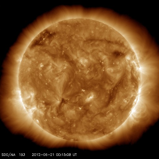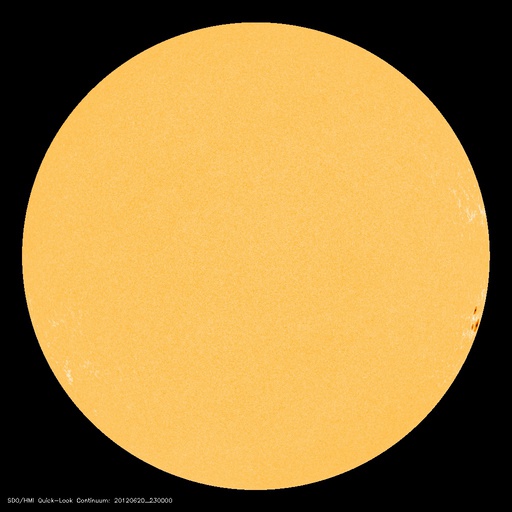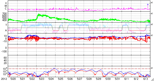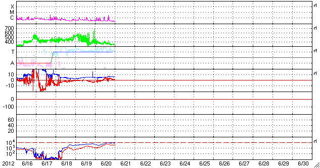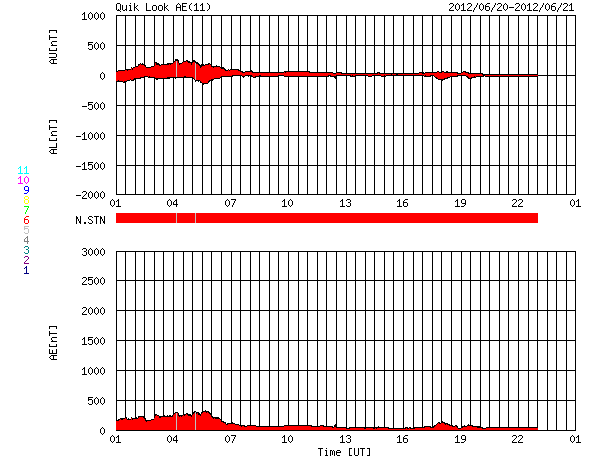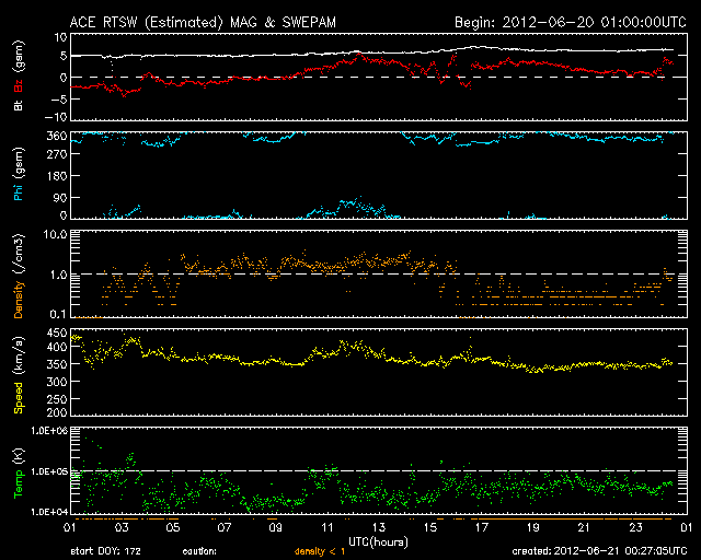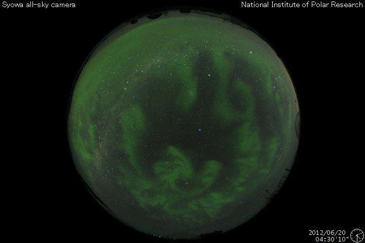 2012/ 6/21 09:27 更新 沈みかけた黒点群でCクラスのフレアが起きています。太陽風、磁気圏は穏やかです。 担当 篠原 太陽の西の端に消えかけたところで、黒点群たちが少し元気になっています。 昨日より、1504黒点群やその周辺で、 C1からC3の小規模フレアが数回にわたって発生しています。 最大のものは、21日1時(世界時20日16時)のC3.1です。 一方、反対の東側には白斑が見られるだけで、今のところ黒点の姿はありません。 このまま無黒点の太陽になるのでしょうか。 もしそうなった場合は、SIDCの記録を参照すると、 昨年8月14日以来、10ヶ月ぶりの記録になります。 太陽風は、400km/秒から350km/秒へ速度が下がり、 低速風になっています。 磁場強度は5nTから6nTと少しだけ上がっていますが、平均的な状態です。 磁気圏も静穏で、AE指数のグラフは後半は特に穏やかです。 太陽にはコロナホールも見られないことから、 今後も太陽風、磁気圏は穏やかな状態が続くでしょう。 ところで、今日、6月21日は夏至です。 日本では太陽が最も高く上る日ですが、 南極の昭和基地は反対に昼でも太陽が上らない日々を迎えています。 と言っても、昼でも真っ暗ということではないようで、 全天カメラの写真を見ると、 北東の空が明るくなってきた頃から、夕焼けが北西の空に消える頃まで、 8時間にわたって撮影が停止されていました。 その前後を動画でつないでみました。 ぼんやりしたオーロラの残る前半と、天の川が縦に延びる後半と、 かすかに見える昭和基地の景色とともにお楽しみ下さい。