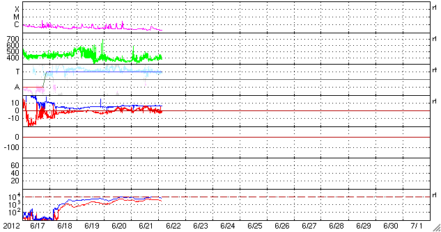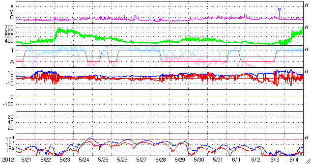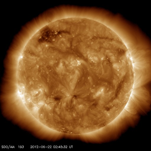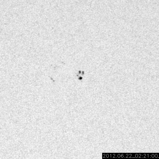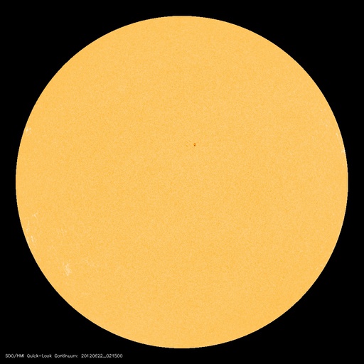 2012/ 6/22 12:32 更新 太陽に小さな黒点が発生しています。太陽風は穏やかで、磁気圏も静穏です。 担当 篠原 10ヶ月ぶりの無黒点日を記録するかと注目してましたが、 昨夜、太陽の中央部に小さな黒点が出現しました。 小さな黒点ですが、記念写真としてSDO衛星で撮影された詳細画像を掲載します。 また、SDO衛星の詳細写真では、東端にももうひとつ小さな黒点が見えています。 最終的には、来月初めに黒点数データが発表されるのを待つ必要がありますが、 この様子だと無黒点日には数えられないのではないかと思います。 1504黒点群たちが没してしまい、太陽は静かになっています。 X線のデータではB7.0のフレアが観測されていますが、 これは、西端に没した1504群で発生したものです。 太陽のフレア活動は、しばらく穏やかでしょう。 太陽風も穏やかに推移しています。 現在の速度は400km/秒、磁場強度は6nTと、どちらも平均的です。 磁気圏も静穏で、AE指数の図は全く変化がありません。 SDO衛星AIA193の太陽コロナ写真を見ると、 太陽の正面にはコロナホールは特になく、穏やかな太陽風が続くでしょう。 北東の高緯度側にコロナホールの影が見えています。 大きさはありますが、緯度がかなり高いので、 地球への影響は限定的でしょう。 27日周期の図を見ると、前周期の6月4日に高速太陽風が始まっています。 原因となったコロナホールは、太陽の東端の向こう側に近づいています。 この高速風は、約10日後の7月1日前後に回帰する可能性があります。 それまでは静かに推移しそうです。 ![]() SDO衛星の可視光写真による、太陽中央部に出現した小さな黒点。 (c) SDO (NASA) ![]() SDO衛星による太陽の可視光写真。マウスの矢印を写真に重ねると、黒点番号付きの写真に切り替わります。 (c) SDO (NASA) ![]() SDO衛星のAIA193カメラによる太陽コロナの様子 (c) SDO (NASA) ![]() GOES衛星の太陽X線データ (c) NOAA/SWPC ![]() ACEが観測した太陽風の磁場(1番上の枠、白線は全体の強度、赤線は南北成分) および、太陽風の密度(3番目の橙線)、速度(4番目の黄線) (c) NOAA/SWPC ![]() リアルタイムAE指数 下段のAEグラフの値が高くなると、オーロラ活動が活発化しています。 (c) 京都大学, NICT ![]() 27日の太陽周期に合わせたデータプロット 太陽が同じ面を地球に向けていた27日前の変化から、今後を予想することができます。 (c) 作図:宇宙天気ニュース