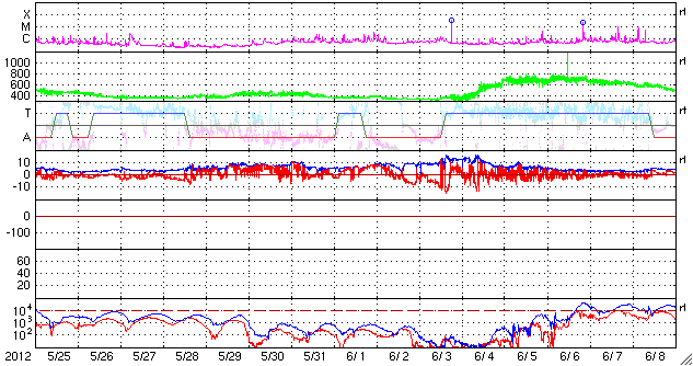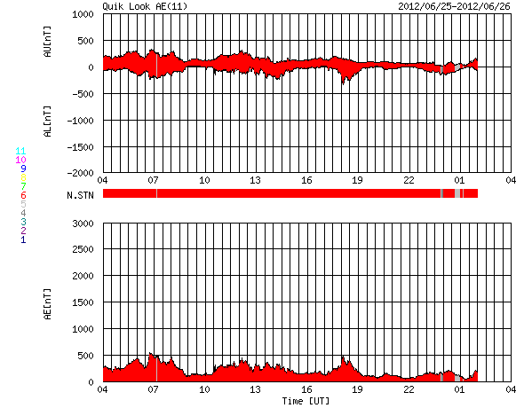 (c) SDO (NASA)、 (動画加工 : 宇宙天気ニュース) ![]() SDO衛星のAIA193カメラによる太陽コロナの様子 (c) SDO (NASA) ![]() SDO衛星による太陽の可視光写真。マウスの矢印を写真に重ねると、黒点番号付きの写真に切り替わります。 (c) SDO (NASA) ![]() GOES衛星の太陽X線データ (c) NOAA/SWPC ![]() ACEが観測した太陽風の磁場(1番上の枠、白線は全体の強度、赤線は南北成分) および、太陽風の密度(3番目の橙線)、速度(4番目の黄線) (c) NOAA/SWPC ![]() リアルタイムAE指数 下段のAEグラフの値が高くなると、オーロラ活動が活発化しています。 (c) 京都大学, NICT ![]() 27日の太陽周期に合わせたデータプロット 太陽が同じ面を地球に向けていた27日前の変化から、今後を予想することができます。 (c) 作図:宇宙天気ニュース