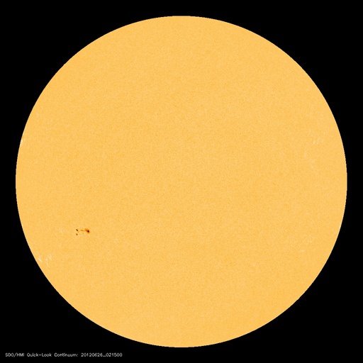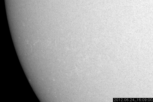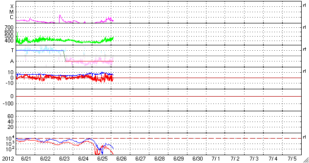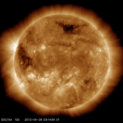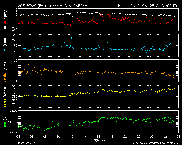 2012/ 6/26 12:32 更新 1512黒点群が少し大きくなり、Cクラスのフレアを起こしています。太陽風の速度はやや高速です。 担当 篠原 昨日、太陽の南東部に現れた黒点群は、1512黒点群と番号が付きました。 その後発達して、黒点が大きくなっています。 成長の様子を、SDO衛星の可視光写真で紹介します。 発達するときの黒点の変化は、なかなかダイナミックで見応えがあります。 1512黒点群は、C1.4の小規模フレアを起こしています。 また、東端のまだ向こう側にある領域でフレアが発生して、 C1.0程度の変化がX線グラフに記録されています。 SDO衛星AIA193の写真で、左端の明るくなっているところです。 この後どんな活動領域が顔を見せるのか、注目してください。 太陽風は、速度がゆっくりと上昇して、350km/秒の低速風から、 450km/秒とやや高速の風になっています。 前周期に見られた速度の小さな高まりが、回帰した様です。 一方、磁場強度は、10nTから5nTに下がり、平均的な強さに戻っています。 磁場の南北成分は、昨日のニュースの後から南寄りになって、 -5nT近い南向きに振れています。 そのため、磁気圏の活動がやや強まって、 AE指数のグラフでは、300〜500nTの小規模の変化が発生しています。 磁場の南北成分は、今日に入った頃から0nT付近で振れるようになり、 それに連れて、磁気圏の変動は弱まっています。 この後も、太陽風は基本的には穏やかな状態が続き、 磁気圏も静穏か、小規模の変動が見られる程度でしょう。 SDO衛星AIA193によると、太陽の東端(左端)に現れたコロナホールは、 大きな姿を見せ始めました。 まだ、向こう側に延びていて、 全体の姿が見えるのは、明後日くらいになりそうです。 来週は、この領域から吹き出してきた高速太陽風の影響を受けることになりそうです。