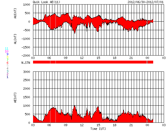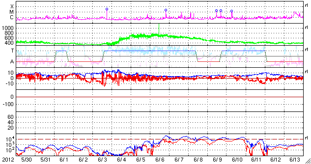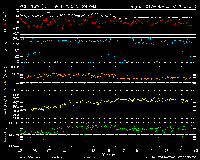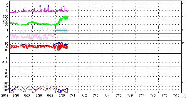 2012/ 7/ 1 11:24 更新 Mクラスのフレアが2回発生しています。650km/秒の高速太陽風がやって来ました。 担当 篠原 1513黒点群で、Mクラスの中規模フレアが2回発生しました。 30日22時(世界時30日13時)にM1.0、 7月1日3時半(世界時30日18時半)にM1.6です。 GOES衛星の動画をご覧下さい。 動画開始後に「Faster」ボタンを2回くらい押すと、見やすい速度になります。 X線のグラフでは、2つのMフレアはどちらも短時間の変化で (M1.0のフレアは、グラフの問題でMのレベルまで線が上がっていません)、 CME(太陽ガスの放出現象)は伴っていないと思われます。 現在、NASAのサイトに問題があるのか、 SDO衛星、SOHO衛星ともにページを見ることができません。 仕方ありませんので、太陽の画像については、 NOAA/SWPCのGOES衛星のX線画像を掲載します。 中央から北東(左上)に寄った辺りの明るい領域が1513黒点群です。 1513群の下の1514黒点群でも、C4.4、C2.7などのフレアが発生しています。 太陽では、この後も同程度の活発な活動が見られそうです。 太陽風は、昨日のニュースの後、そのまま速度が上がって、 高速風が始まりました。 30日19時(世界時30日10時)に、600km/秒まで上昇しています。 その後、現在まで650km/秒となかなか高い速度で安定しています。 27日周期の図を参照すると、前周期よりも1日早い到来です。 磁場強度は、昨日いっぱいは10nT前後と強まっていましたが、 今日に入ったくらいから7nTくらいに少し下がっています。 しかし、まだ平均よりは高く、高速風はまだ前半部にあるのでしょう。 太陽風磁場の南北成分は、ACEのグラフの前半で頻繁に南向きに振れています。 -10nTの振れ幅も見られます。 このため、磁気圏の活動も活発化して、 AE指数のグラフでは、1000nTに及ぶ様な大きめの変動が記録されています。 極域では活発なオーロラの活動が見られたのではないかと思います。 グラフの後半は、振れ幅が少し減って、500nT程度に下がっていますが、 これは、太陽風磁場の強度が少し下がってきたこともあって、 南向きへの振れ幅が小さくなって来たためでしょう。 GOES衛星のX線写真を見ると、コロナホールは、太陽の中心を通過中です。 これから4〜5日程度は高速風は続くのではないかと思います。