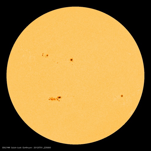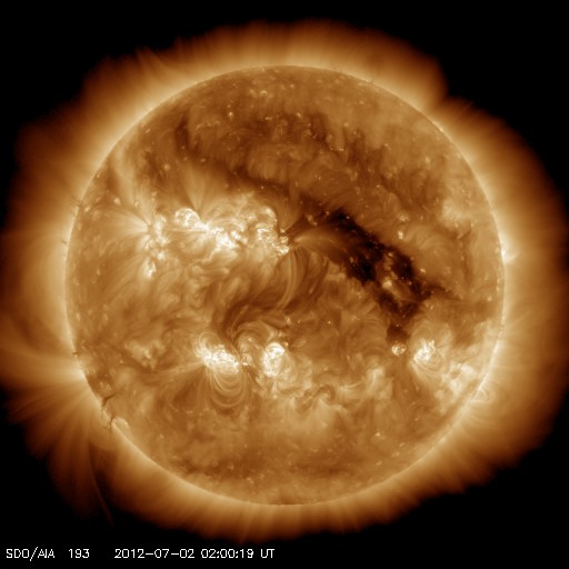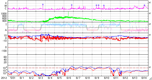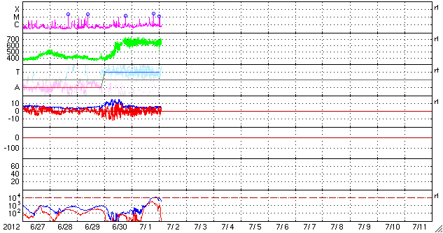 2012/ 7/ 2 11:26 更新 Mクラスのフレアが発生して、太陽の活動は続いています。太陽風も650km/秒と高速です。 担当 篠原 太陽のフレア活動が続いています。 1日16時(世界時1日7時)に、1513群でC5.4、 2日0時半(世界時1日15時半)に、1515群でC8.2、 2日4時(世界時1日19時)に、1513群でM2.8、 そして先ほど、2日9時半(世界時2日0時半)に、1513群でM1.1 など大きめのフレアが次々に発生しています。 GOES衛星のX線カメラによるこの1日間の活動の様子をご覧ください。 北半球の1513群だけでなく、 南半球の1515群付近も活発に輝いています。 可視光写真は2日ぶりですが、 南半球の1515黒点群の大きさが目立っています。 黒点群の活動度の高い状態は続いているようです。 更に大きな活動を起こすことがあるかもしれません。 太陽風は、650km/秒前後の高い速度(ACEの図の黄色線)の風が続いています。 磁場強度(白線)は5nTと平均的な強度に下がり、高速風領域としては中盤に入った印象です。 磁場の南北成分(赤線)は、やや北寄り(プラス方向)に向いている様ですが、 南向き(マイナス方向)にも頻繁に振れていて、 その影響で中規模のオーロラ活動が活発に発生しているようです。 AE指数のグラフを見ると、500nTから1000nTに達する変動が1日中観測されています。 SDO衛星AIA193の太陽コロナ写真を見ると、 今回の高速太陽風をもたらしたコロナホールは、 濃い部分が太陽の中心線を越え、西半球側に入っています。 すると、高速風の影響も3〜4日程度と見積もられます。 27日周期の図を見ると、前回の高速風は6月8〜9日に終わっていて、 これは7月5〜6日に相当します。 今回の高速風の影響で、放射線帯の高エネルギー電子が増加しています。 青線のGOES-15は10,000に達しています。 高速風が続いていることから、明日は更に高まる可能性があります。 [お詫び] 学校内部のメールシステムが停止したため、土曜日以降通知メールを配信できず、 しかも、今朝、システムが回復するとともに、 溜まっていたメールが一斉に届けられてしまいました。 たいへん申し訳ありません。 現在は正常に動いている様です。 ![]() GOES-15衛星のX線カメラによる、活発に活動する太陽の様子。 (c) NOAA/SWPC 、(動画加工 : 宇宙天気ニュース) ![]() SDO衛星のAIA193カメラによる太陽コロナの様子 (c) SDO (NASA) ![]() SDO衛星による太陽の可視光写真。マウスの矢印を写真に重ねると、黒点番号付きの写真に切り替わります。 (c) SDO (NASA) ![]() GOES衛星の太陽X線データ (c) NOAA/SWPC ![]() ACEが観測した太陽風の磁場(1番上の枠、白線は全体の強度、赤線は南北成分) および、太陽風の密度(3番目の橙線)、速度(4番目の黄線) (c) NOAA/SWPC ![]() リアルタイムAE指数 下段のAEグラフの値が高くなると、オーロラ活動が活発化しています。 (c) 京都大学, NICT ![]() 27日の太陽周期に合わせたデータプロット 太陽が同じ面を地球に向けていた27日前の変化から、今後を予想することができます。 (c) 作図:宇宙天気ニュース