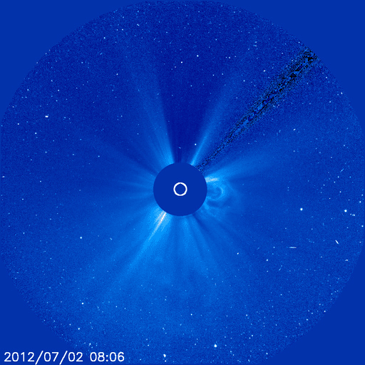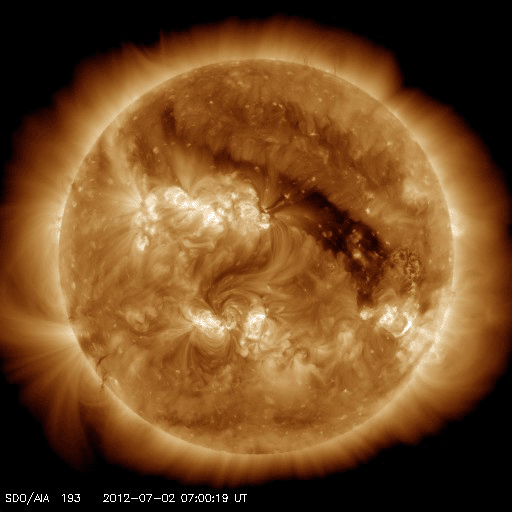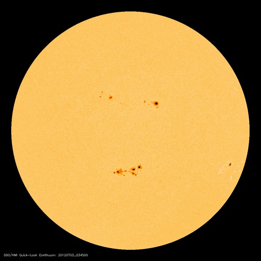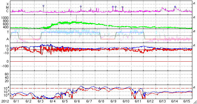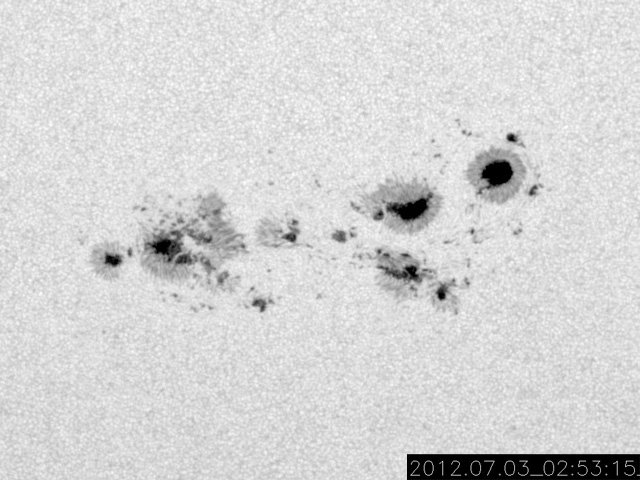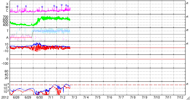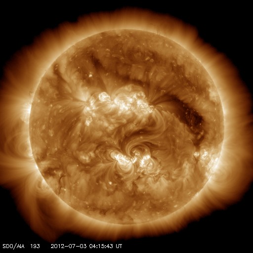 2012/ 7/ 3 13:44 更新 太陽の1515黒点群が活発になり、Mクラスのフレアを3回起こしています。 担当 篠原 大きくなっていた1515黒点群が活発なフレア活動を起こしています。 昨日の夜、2日20時(世界時2日11時)に起きたM5.6と大きめの中規模フレアを始まりに、 今朝、3日5時(世界時2日20時)にM3.8、 続いて3日9時(世界時3日0時)にM2.0とMクラスのフレアを3回。 その他にも多数のCクラスフレアを起こしています。 フレアは、1513群、1514群でも発生していて、X線のグラフは激しく変動しています。 SDO衛星による、1515黒点群の拡大写真を1枚目に掲載します。 また、活発に活動する様子を、SDO衛星のAIA193と304カメラの動画でご覧ください。 動画では、フレアと共にコロナのガスが激しく噴き出して行く様子も見えます。 この噴き出しは、CME(太陽ガスの放出現象)としてSOHO衛星LASCO C3で観測されています。 黒点が南に寄っているため、ガスの噴き出しは南方向に偏っています。 地球方向への噴き出しは弱そうですが、 太陽の中心付近で発生しているので、擾乱がやって来る可能性は高いと思います。 3日後の7月5日午後から6日にかけて、太陽風の変化に注目してください。 黒点群たちは、現在も活発に活動しています。 このニュースの直前にもC9.9とMクラス寸前の大きめのフレアが発生しました。 引き続き太陽の活動に注目してください。 太陽風は、650km/秒からゆっくりと速度が下がって、 現在は600km/秒を割りそうなところです。 磁場強度も、5nTから4nTに若干下がり、高速風は後半に入りつつあるようです。 太陽風磁場の南北成分は、 振れ幅は小さくなってきましたが、南向きに良く振れていて、 この影響で活発な磁気圏のオーロラ活動が発生しています。 AE指数のグラフは、500nTから1000nTに及ぶ中規模の変動が連続的に発生しています。 太陽風の様子から、高速風領域は後半に入った様です。 もう2〜3日は高速状態が続くと思われますが、 今後は、速度が次第に低下して、磁場強度も下がって行き、 磁気圏の活動も規模が小さくなって行くでしょう。 その後、今日のCMEの影響がやって来て、一時的に太陽風の乱れが見られる、 という展開になりそうです。 様々な乱れが重なって、宇宙天気はとても興味深い展開になっています。 放射線帯の高エネルギー電子は、今日も高いレベルを保っています。 こちらは当分の間、高いレベルを保つ可能性があります。 今朝、同じフレア(M3.8)の検出メールが、時間を置いて2度(5時半と8時半に)送信されました。 大きめのフレアだったこともあり、お騒がせしました。 検出ソフトの問題でしたので、今日、修正を行いました。 重複検出はもう起きないと思いますが、しばらく様子を見たいと思います。 ![]() SDO衛星の可視光写真による、巨大な1515黒点群の様子。 (c) SDO (NASA) ![]() SDO衛星のAIA193と304カメラによる、太陽のフレア活動の様子。 (c) SDO (NASA)、 (動画加工 : 宇宙天気ニュース) ![]() SOHO衛星LASCO C3カメラによる、太陽から南寄りに噴き出して行くCME。 (c) SOHO (ESA & NASA)、 (動画加工 : 宇宙天気ニュース) ![]() SDO衛星のAIA193カメラによる太陽コロナの様子 (c) SDO (NASA) ![]() SDO衛星による太陽の可視光写真。マウスの矢印を写真に重ねると、黒点番号付きの写真に切り替わります。 (c) SDO (NASA) ![]() GOES衛星の太陽X線データ (c) NOAA/SWPC ![]() ACEが観測した太陽風の磁場(1番上の枠、白線は全体の強度、赤線は南北成分) および、太陽風の密度(3番目の橙線)、速度(4番目の黄線) (c) NOAA/SWPC ![]() リアルタイムAE指数 下段のAEグラフの値が高くなると、オーロラ活動が活発化しています。 (c) 京都大学, NICT ![]() 27日の太陽周期に合わせたデータプロット 太陽が同じ面を地球に向けていた27日前の変化から、今後を予想することができます。 (c) 作図:宇宙天気ニュース