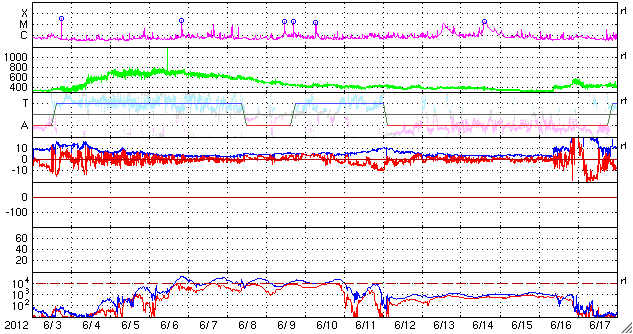 (c) NOAA/SWPC 、(動画加工 : 宇宙天気ニュース) ![]() 3日間のX線データと検出されたフレア(C3以上)。とても活発になっている。 (c) 作図:宇宙天気ニュース ![]() SDO衛星による、1515黒点群の拡大写真。 (c) SDO (NASA) ![]() SDO衛星のAIA193カメラによる太陽コロナの様子 (c) SDO (NASA) ![]() SDO衛星による太陽の可視光写真。マウスの矢印を写真に重ねると、黒点番号付きの写真に切り替わります。 (c) SDO (NASA) ![]() GOES衛星の太陽X線データ (c) NOAA/SWPC ![]() ACEが観測した太陽風の磁場(1番上の枠、白線は全体の強度、赤線は南北成分) および、太陽風の密度(3番目の橙線)、速度(4番目の黄線) (c) NOAA/SWPC ![]() リアルタイムAE指数 下段のAEグラフの値が高くなると、オーロラ活動が活発化しています。 (c) 京都大学, NICT ![]() 27日の太陽周期に合わせたデータプロット 太陽が同じ面を地球に向けていた27日前の変化から、今後を予想することができます。 (c) 作図:宇宙天気ニュース