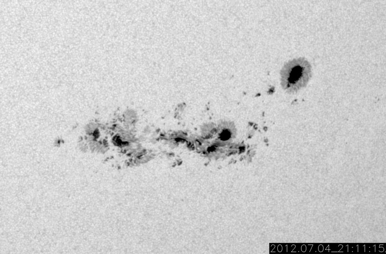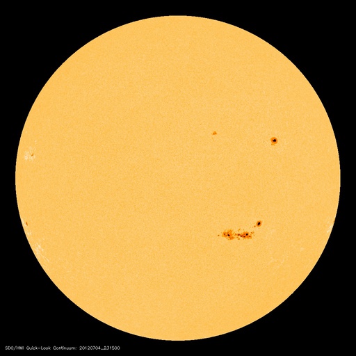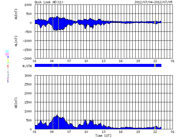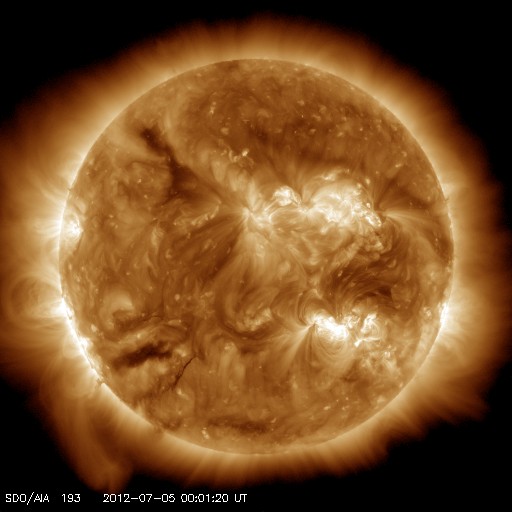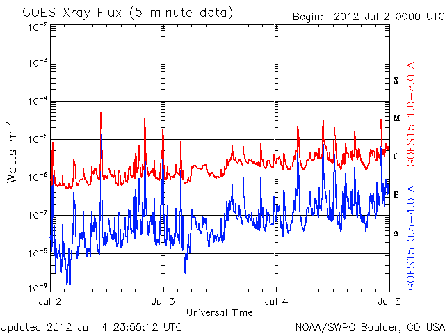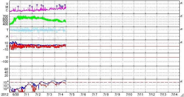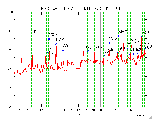 2012/ 7/ 5 09:31 更新 太陽のフレア活動が活発化して、Mクラスフレアが7回発生しています。引き続き注意が必要です。 担当 篠原 太陽の活動がとても活発になっています。 昨日のニュース以降、1515黒点群と1513黒点群などで、 Mクラスの中規模フレアが7回発生しています。 4日13時半(世界時4日4時半)に、1515群でM2.3、 4日19時(世界時4日10時)に、1515群でM5.3、 4日21時(世界時4日12時)に、1515群でM2.3、 4日23時半(世界時4日14時半)に、1515群でM1.3、 5日1時半(世界時4日16時半)に、1513群でM1.8、 今朝、5日7時半(世界時4日22時)に、1515群でM4.6、 そして、つい先ほど、4日9時(世界時4日23時)にもM1.2のフレアが発生しました。 (場所はまだ分かりません) この他にも、多数のCクラスフレアを起こしています。 2枚目に掲載している、フレア検出(C3以上)付きのX線の図を見て下さい。 大量に印が書かれていて、判別ができない状態です。 SDO衛星による、1515黒点群の拡大写真も掲載します。 巨大で複雑な形をしています。 Xクラスの大規模フレアも含めて、今後も活動には注意が必要でしょう。 太陽は、東端にも活動的な領域があるようです。 今後は、こちらでも小規模フレアの発生が見られるかもしれません。 太陽風は、速度(ACEの図の黄色線)が一段下がって、 500km/秒と高速風ぎりぎりの速さにまで下がってきました。 高速風も終わりが近いようです。 27日周期の図で前周期の変化と比べると、 到来が1日早まった分、終わりも1日くらい早まっている様な変化です。 今日いっぱいくらいで高速風は終わってしまうのかもしれません。 磁場強度(白線)は、5nT前後と平均的な状態です。 南北成分(赤線)は、図の前半は南に(マイナスに)振れていますが、 後半は北寄り(プラス)になっています。 このため、オーロラの活動度を表すAE指数のグラフも、 前半は小中規模の変動が起きていますが、後半は静かになっています。 今後は速度が下がって行くことから、基本的には静かになっていくと思います。 今日の午後から明日にかけて、 2日夜に発生したCMEによる太陽風の乱れが到来するかもしれません。 南側を中心に噴き出していたので、影響は限定的でしょう。 速度上昇や、磁場強度の強まりが発生するかもしれません。 しばらくACEのデータに注目してください。