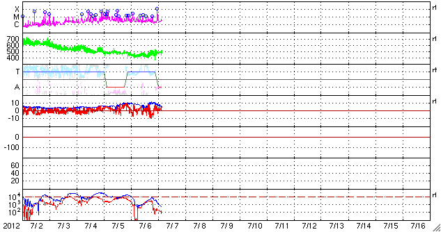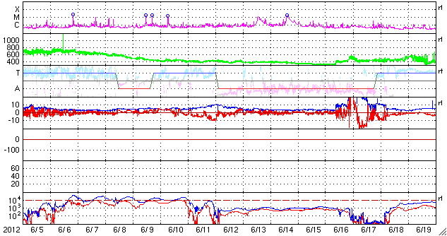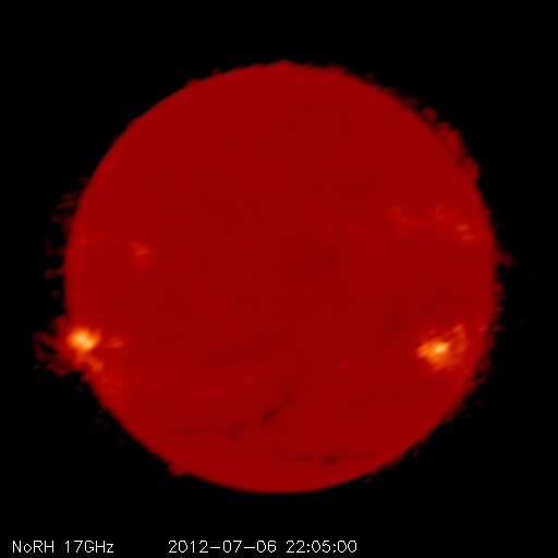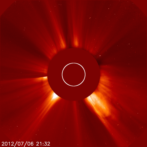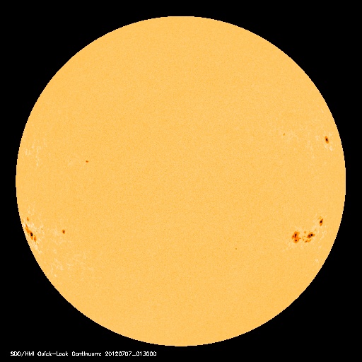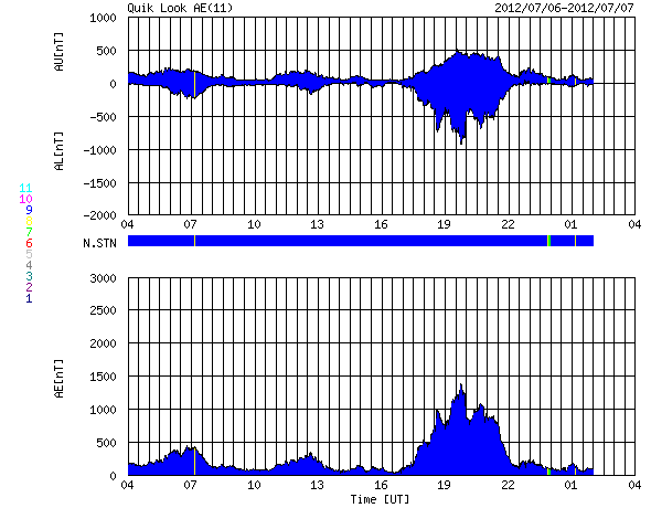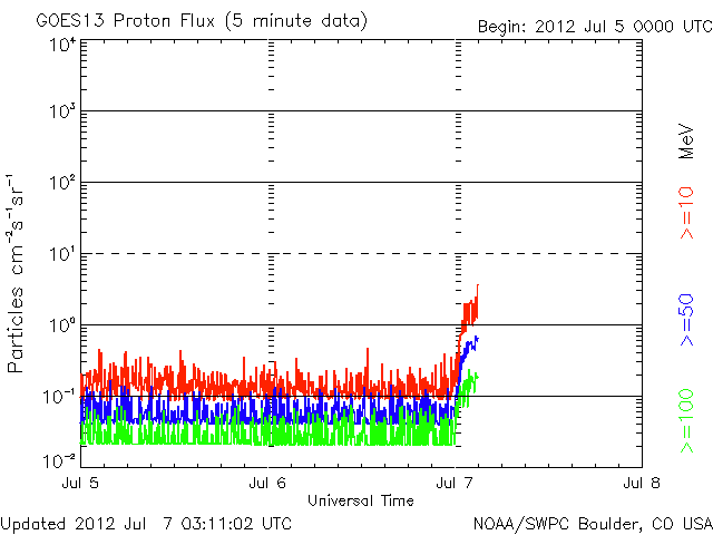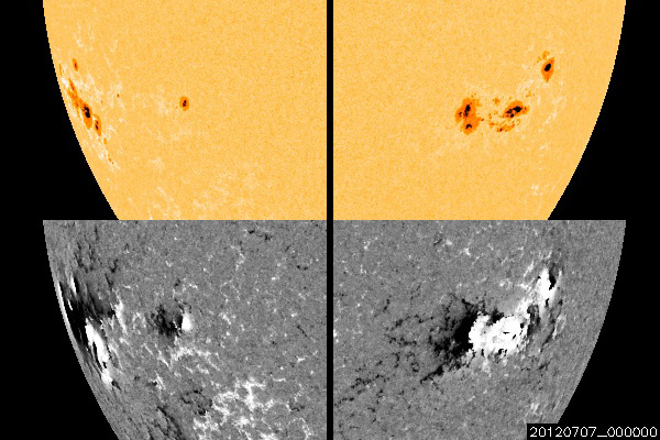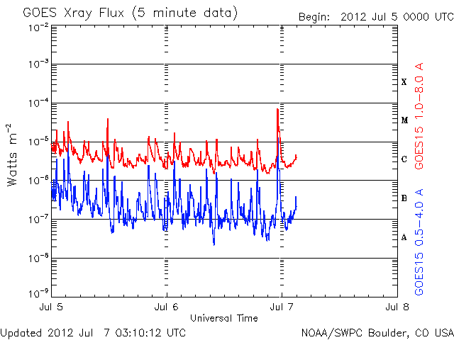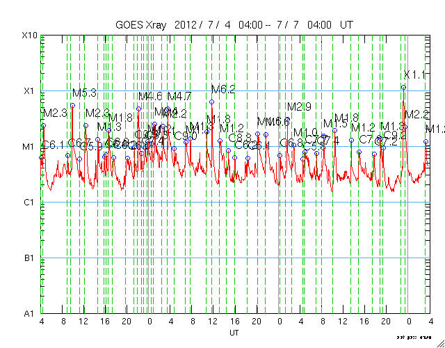 2012/ 7/ 7 12:14 更新 X1.1の大規模フレアが発生しました。太陽では活発にフレアの発生が続いています。 2012/ 7/ 7 12:47 追加 太陽風、磁気圏関係の図を追加します。 担当 篠原 太陽では、活発にフレアの発生が続いています。 今朝、7日8時(世界時6日23時)には、X1.1の大規模フレアが発生しました。 Xクラスのフレアは、3月7日以来、ちょうど4ヶ月ぶりの発生です。 太陽の南西部(右下)の1515群付近で発生しています。 この領域は、7月2日以降、MクラスやCクラスのフレアを多数起こし続けてきましたが、 Xクラスに達したのはこれが初めてです。 しかし、短い時間の増光だったため、 掲載しているGOES衛星のX線グラフでは、赤線はXのラインまで届いていません。 また、GOES衛星のX線カメラの動画も掲載しましたが、 最も輝いた時間の写真は欠落していて、ぼわっとフレアの余韻だけが見えています。 国立天文台野辺山太陽電波観測所の野辺山電波ヘリオグラフが、 フレアの様子を捉えています。 17GHzの電波で観測した太陽の活動です。 動画を掲載しましたので、ご覧ください。 SOHO衛星LASCOカメラによると、CME(太陽ガスの放出現象)も発生しています。 写真が揃っていなかったので、噴き出した直後までですが、 南西(右下)に向かって、白いガスが噴出しています。 かなり横方向なので、地球への影響はないでしょう。 そして、太陽放射線(非常に高速の陽子線)の増加も観測されています。 GOES衛星のグラフでは、警戒レベルには届いていませんが、 1の線を超えるくらいに増加しています。 フレアが太陽の西側で発生すると、太陽風の磁場のら旋構造に乗って、 短い時間で地球へやって来ます。 1515黒点群は、昨日のニュース以降も活発な活動を続けていました。 Mクラスのフレアだけでも、M1.0、M1.5、M1.8、M1.2、M1.3と、5回発生しています。 しかし、昨日に比べると、規模も頻度も下がってきて、 活動も終わりに近付いているのかなと感じていたところでXクラスが発生しました。 (油断大敵です・・・) また、太陽の南東端(左下)でも、フレアの発生が見られています。 ここからは、もうひとつ巨大な黒点群が顔を出しています。 1515群と並べて拡大写真を掲載します。 太陽の両端の写真をくっつけているので、いびつな写真に見えますが、 加工などはしていません。 写真の下半分は、磁場分布の写真です。 どちらの黒点群も、複雑な磁場構造をしています。 引き続き、フレアの発生に注意してください。 太陽風は、440km/秒から500km/秒近くにやや上がって、 再び高速風に変わっています。 磁場強度は5〜10nTと強めの値で推移しています。 途中、磁場の南北成分が大きく南を向いた時間帯があり、 そこで、AE指数1000nTを超える大きな磁気圏活動が発生しています。 昭和基地の全天カメラで、オーロラの変動が撮影されています。 月明かりがあるため、あまり派手な写真ではありません。 これから、太陽の活発な活動は東端の新しい黒点群に引き継がれるのでしょうか。 これだけにぎやかなのも、太陽活動極大期の今だけです。 来年前半とも言われている極大を通り過ぎると、 太陽活動は次第に静かになってしまいます。 次回の保証がある活動ではありませんので、どうぞじっくり見届けて下さい。 2012/ 7/ 7 12:47 追加 (篠原) 関連の図はページの最後にあります 先ほどのニュースで、太陽風や磁気圏関係の図を忘れていました。 すみません。 記録のために、先ほどのページに追加します。 また、フレア自動検出の図も掲載します。 緑線と青丸だらけになった図をご覧ください。 ![]() SDO衛星の太陽可視光写真。7月7日9時(世界時7日0時) (c) SDO (NASA) ![]() 東西の巨大黒点群の拡大写真。上半分は可視光写真、下半分は磁場分布の写真。 (c) SDO (NASA) ![]() GOES-15衛星のX線カメラによるXフレア。 (c) NOAA/SWPC 、(動画加工 : 宇宙天気ニュース) ![]() 野辺山電波ヘリオグラフが観測したXフレアの様子。 (c) 国立天文台野辺山太陽電波観測所 ![]() SOHO衛星LASCO C2、C3による噴き出しかけのCME。 (c) SDO (NASA)、(動画加工 : 宇宙天気ニュース ) ![]() GOES衛星の太陽X線データ (c) NOAA/SWPC ![]() GOES衛星の太陽放射線データ (c) NOAA/SWPC ![]() 2012/ 7/ 7 12:47 追加 3日間のX線データと検出されたフレア(C3以上)。とても活発になっている。 (c) 宇宙天気ニュース ![]() ACEが観測した太陽風の磁場(1番上の枠、白線は全体の強度、赤線は南北成分) および、太陽風の密度(3番目の橙線)、速度(4番目の黄線) (c) NOAA/SWPC ![]() リアルタイムAE指数 下段のAEグラフの値が高くなると、オーロラ活動が活発化しています。 (c) 京都大学, NICT ![]() 27日の太陽周期に合わせたデータプロット 太陽が同じ面を地球に向けていた27日前の変化から、今後を予想することができます。 (c) 作図:宇宙天気ニュース