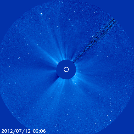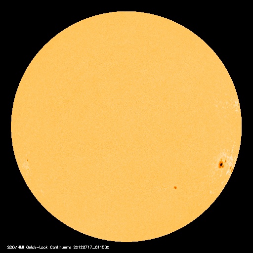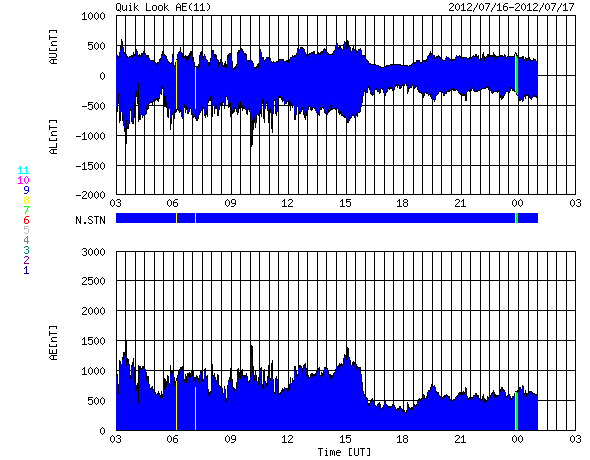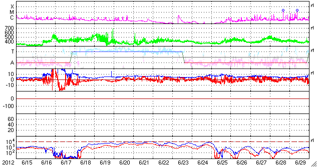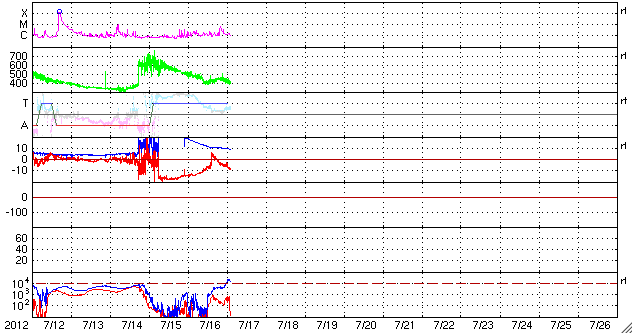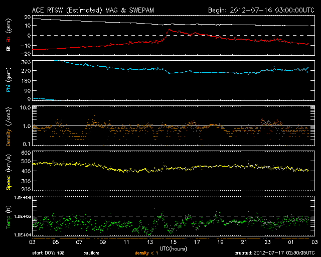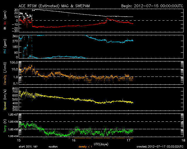 2012/ 7/17 11:30 更新 太陽風磁場の強い南向きは、一旦終わりましたが再び強まっています。 担当 篠原 南向きに強まっていた太陽風の磁場は、 昨夜、16日23時半(世界時16日14時半)に、一旦北向きに切り替わりましたが、 その後、再び南向きに振れるようになり、 現在も-10nT近い強い南向きになっています。 太陽風の磁場が南向きに強まると、 太陽風から地球の磁気圏へ電気的なエネルギーが大量に流れ込む様になります。 このため、南向き磁場が強まると磁気圏の擾乱が強まるのです。 今日の1枚目に、3日幅のACE衛星のグラフを掲載します。 図の最初に、磁場が南向きに大きく振れた変化が見えています。 それからおよそ32時間にわたって南向き(赤線がマイナスに振れている)が続きました。 南向き磁場の振れ幅は、初めは-20nT近く、その後ゆっくりと弱まって、 最後は -5nTほどで急に北向きに切り替わっています。 しかし、磁場の南北成分はすぐにまた南に振れ始め(マイナスに下がって行く)、 次第に振れ幅が大きくなりました。 現在は-10nT近くまで振れていますが、磁場強度も10nTですので、 これ以上大きく南に向くことはなさそうです。 太陽風の速度は、昨日は500km/秒でしたが、 ゆっくり下がって、現在は400km/秒と平均的な速さです。 太陽風の磁場変化に合わせて、磁気圏の活動も続いています。 AE指数のグラフは、前半は1000nT近い変化に、 後半は少し弱まって、500nT程度になっています。 変化としては昨日ほどの激しさは見られず、次第に小さくなっています。 太陽風の乱れが次第に小さくなっているためです。 現在の南向き磁場は、どこまで続くでしょうか。 引き続き注目してください。 太陽では、1520黒点群が西の端に近付いています。 今日も拡大写真を掲載します。 黒点としては、次第に小さくなっている様です。 1520群はC7.5の大きめのCクラスフレアを起こしていますが、 活動度は下がっている印象です。 太陽の東には、小さな黒点が姿を現しています。 小さなフレアの活動も起こしています。 また、SOHO衛星LASCO C3によると、 太陽の横を小型の彗星が通り過ぎて行きました。 太陽通過に短い尾を引くようになっています。 12日から16日にかけての様子を動画でご覧ください。 放射線帯の高エネルギー電子は、強まりそうな様子を見せています。 太陽風の変化が終わる頃にどのレベルで落ち着くでしょうか。 ![]() ACEによる、3日幅の太陽風の変化。白線は磁場強度、赤線は南北成分、黄色は速度です。 (c) NOAA/SWPC ![]() SDO衛星の可視光写真による、西の端に沈みつつある1520黒点群。 (c) SDO (NASA) ![]() SOHO衛星LASCO C3カメラに、7月12日から今日にかけて太陽の横を通過する彗星が見えました。 (c) SOHO (ESA & NASA)、 (動画加工 : 宇宙天気ニュース) ![]() SDO衛星のAIA193カメラによる太陽コロナの様子 (c) SDO (NASA) ![]() SDO衛星による太陽の可視光写真。マウスの矢印を写真に重ねると、黒点番号付きの写真に切り替わります。 (c) SDO (NASA) ![]() ACEが観測した太陽風の磁場(1番上の枠、白線は全体の強度、赤線は南北成分) および、太陽風の密度(3番目の橙線)、速度(4番目の黄線) (c) NOAA/SWPC ![]() リアルタイムAE指数 下段のAEグラフの値が高くなると、オーロラ活動が活発化しています。 (c) 京都大学, NICT ![]() 27日の太陽周期に合わせたデータプロット 太陽が同じ面を地球に向けていた27日前の変化から、今後を予想することができます。 (c) 作図:宇宙天気ニュース