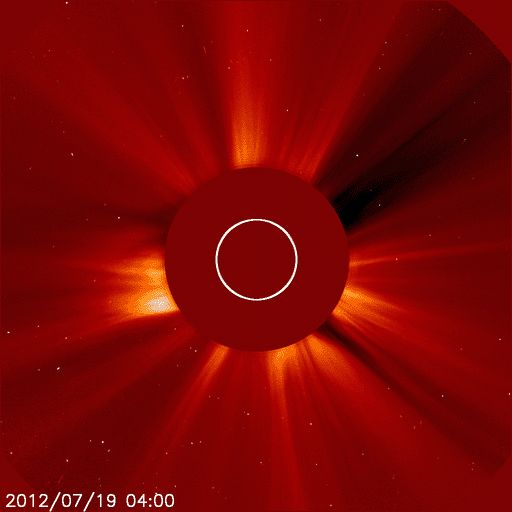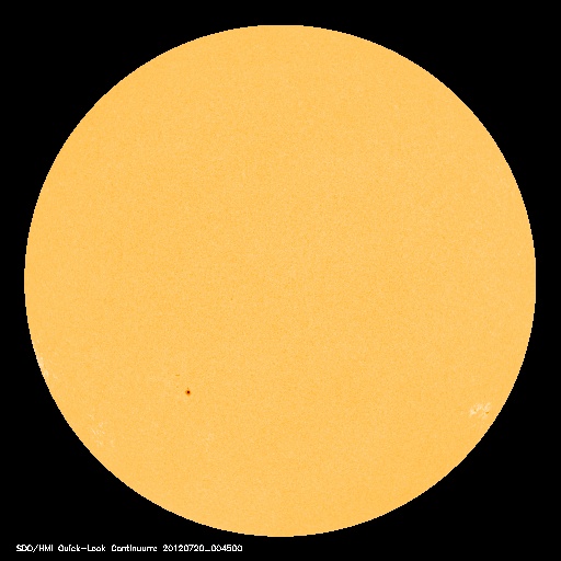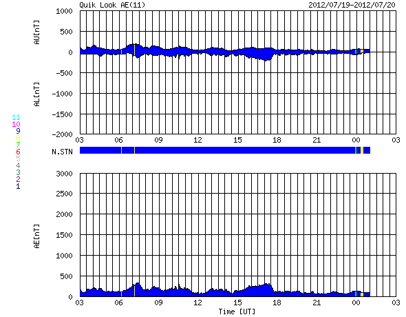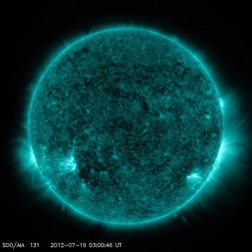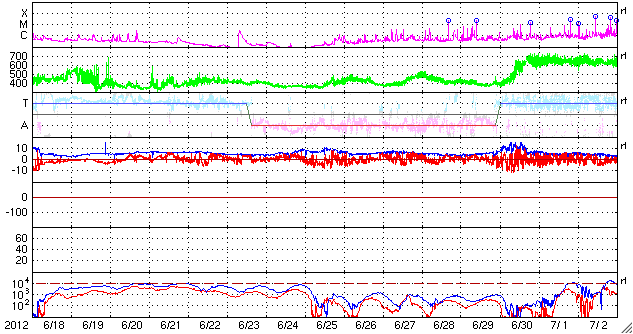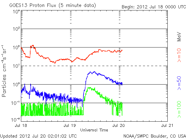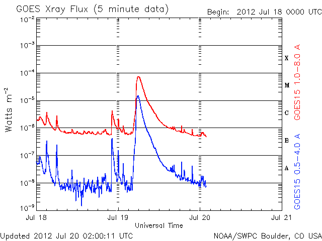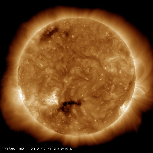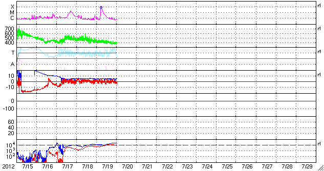 2012/ 7/20 11:04 更新 西の端の1520黒点群でM7.74の中規模フレアが発生しました。CMEが噴出しています。 担当 篠原 西に沈んで行った1520黒点群で、M7.7の中規模フレアが発生しました。 昨日の昼、19日13時半(世界時19日4時半)です。 その様子を、SDO衛星AIA131の動画で紹介します。 このカメラは、1000万度(Wikipediaによると、40万度、1000万度、1600万度の3種)と、 いつも掲載しているAIA193(120万度、2000万度)よりも、 高い温度の変化を良く見ることができる様です。 (どちらも、代表的な温度が複数あるので単純ではありませんが) フレアの輝きが目立って写っていたので今日はこちらを掲載しました。 いつものAIA193(動画)とは違う雰囲気の動画をお楽しみ下さい。 GOES衛星のX線グラフを見ると、このフレアは半日にわたって変化が続いています。 この様な時は、CME(太陽ガスの放出現象)を伴っていることが多く、 SOHO衛星LASCO C2, C3カメラを見ると、 太陽から右に向かってコロナガスの激しい噴出が発生しています。 地球からは横方向に向かっているので、影響はないと思われますが、 動画を見ていると、広角に噴き出しているようで、 多少は変動がやって来るかもしれません。 明後日くらいの太陽風に弱い擾乱が見られるかもしれません。 少し期待して見ていて下さい。 1520群が没して、太陽は一気に寂しくなりました。 黒点群は3つありますが、1525群が多少目立っている程度です。 しかし、GOES衛星のX線カメラでは、 この領域は小さなフレア活動を頻繁に起こしています。 今後、発達に向かうのかどうか注目してください。 また、フレアに伴って、太陽放射線(非常に高速の陽子線)も少し増えています。 太陽風は、ゆっくりと400km/秒を割って、 現在は380km/秒と低速に変わりつつあります。 磁場強度は、5nTと平均的な状態です。 磁気圏も基本的に穏やかです。 AE指数は、小さな変動が頻繁に見られますが、 特に強まる様子はありません。 SDO衛星AIA193の太陽コロナを見ると、 南半球の中心線に小さなコロナホールが達しています。 3日後の23日頃から、太陽風に多少の影響が見られるかもしれません。 放射線帯の高エネルギー電子が、 2つのGOES衛星で10,000に達する高い状態になっています。 人工衛星などで注意が必要な状態になっています。