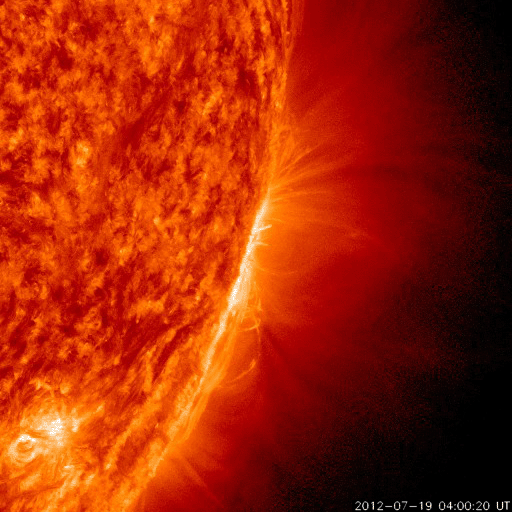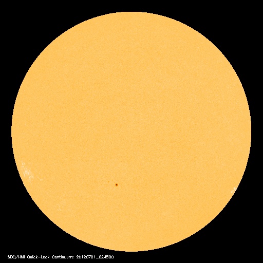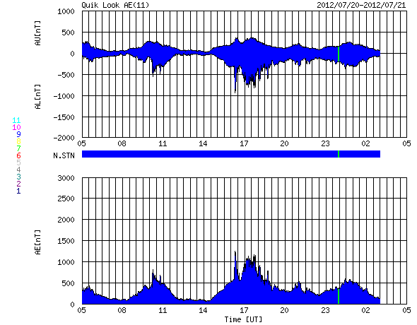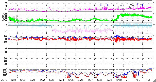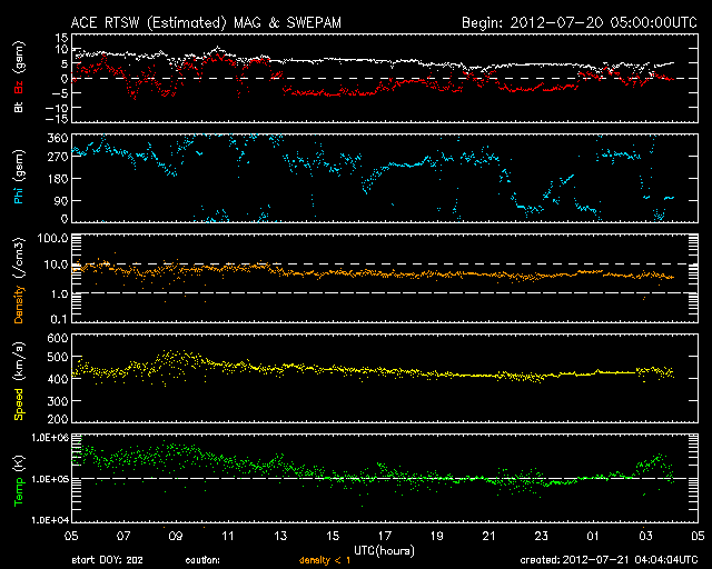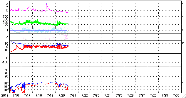 2012/ 7/21 13:04 更新 太陽は黒点も少なく、穏やかです。太陽風は平均的な状態です。 担当 篠原 太陽は、黒点の少ない寂しい状態です。 東側に1526群が発生した様ですが、掲載の可視光写真では白斑しか見えません。 1525群付近で小さなフレア活動は発生していて、 X線グラフを見ると、M7フレアの下り坂の途中に、 小さな爆発がたくさん発生しています。 しかし、黒点群の規模は小さいままで、 フレアの規模も大きくなることはなさそうです。 さて、19日に発生したM7.7フレアの様子を、 今日はSDO衛星AIA304の動画で紹介します。 フレアに続いて発生する、ループ状のプロミネンスの美しい様子をご覧ください。 このカメラは、5万度と比較的低い温度のプラズマを見ています(参考)。 昨日掲載したAIA131の動画と比べてみてください。 太陽風は、速度は420km/秒、磁場強度は5nTと、 平均的な状態です。 磁場の南北成分は、図の中盤で-5nT近い南寄りになっています。 この影響で、AE指数は1000nT近い大きな変化が発生しています。 この前後でも、500nTの中規模の変化が発生していて、 太陽風は平均的ですが、効率良くオーロラ活動が発生している印象です。 (太陽風磁場がどれだけ南に向くかということが重要です) SDO衛星AIA193によると、太陽の南半球にあるコロナホールは、 中心線を過ぎて少し西側に見えています。 規模が小さいのと、緯度が高めであることから、 地球への影響は小規模だと思いますが、 明後日、23日頃から太陽風の速度が上がるなどの変化が やって来るかもしれません。 今日11時に、種子島からH2Bが打ち上げられました。 休日でしたので、大隅半島の南端付近まで見に行こうと企んでいたのですが、 天候が悪くて(雲が厚くて低い・・・)、諦めました。 中継を見ると、現地でもあっという間に雲の向こうに行ってしまった様です。 こうのとりの無事の到着を祈っています。