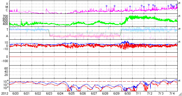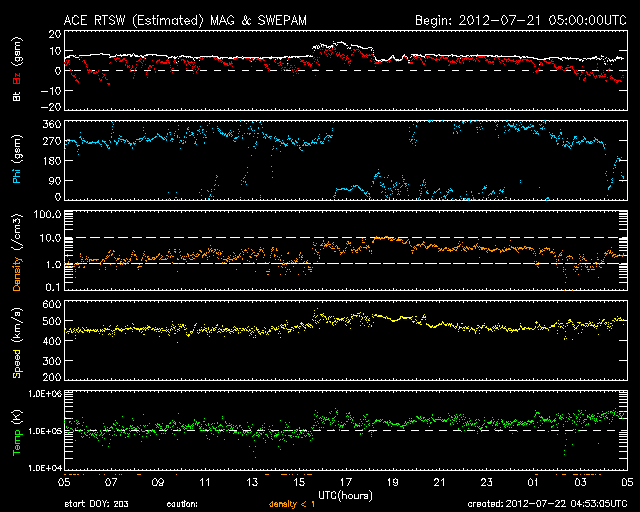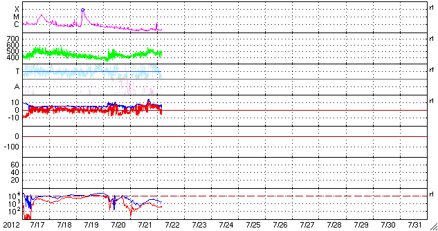 2012/ 7/17 11:30 太陽風磁場の強い南向きは、一旦終わりましたが再び強まっています。