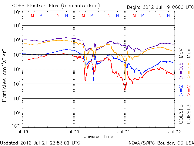 放射線帯電子がやや強くなっています。太陽放射線は静穏です。
