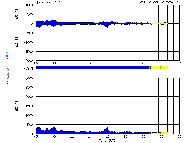 このため磁気圏は穏やかで、AE指数は小さな変化が見られる程度です。