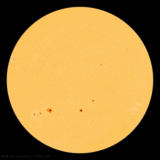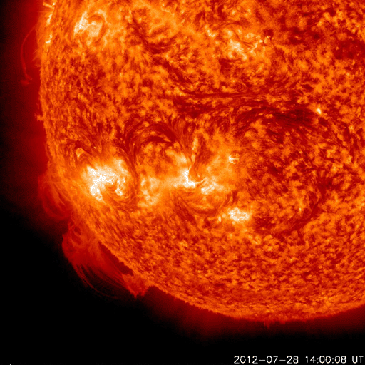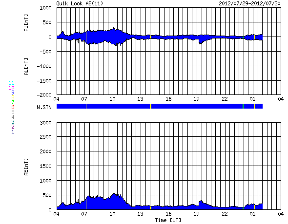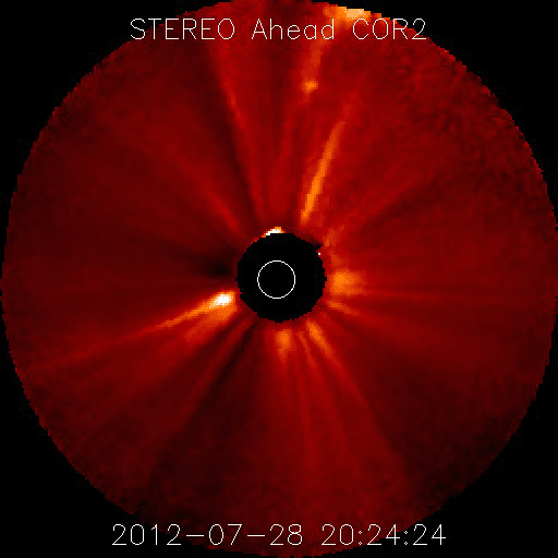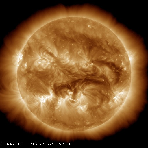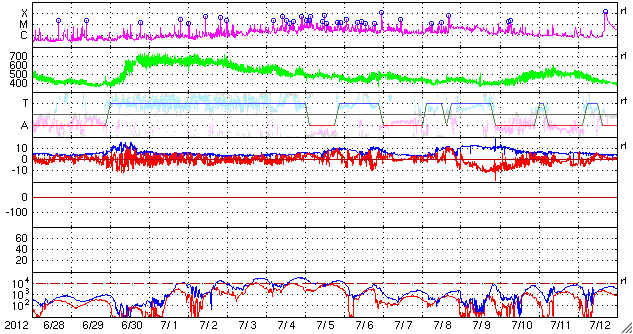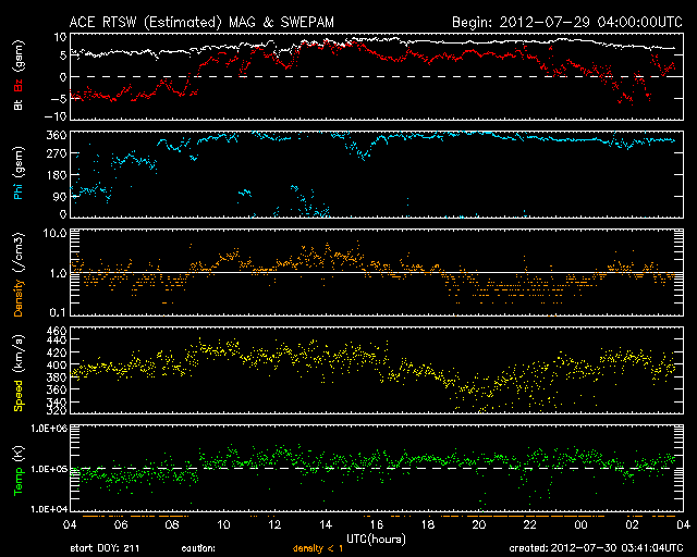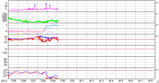 2012/ 7/30 12:42 更新 M2.3の中規模フレアが発生しました。太陽風は平均的な速度で安定しています。 担当 篠原 昨日のニュースで紹介したM6.1フレアに続いて発生した 太陽の南東端と中央部で見られたプロミネンスの変化が見事だったので、 少し拡大した動画で紹介します。 太陽の南東部に広がる、スケールの大きな活動でした。 できれば、更に大きな写真で紹介したいのですが、 両方の変化をと欲張ると、このくらいになってしまいました。 また、M6.1フレアとフィラメントの噴出によるCMEの様子を、 STEREO Ahead衛星のCOR2で紹介します。 2つのCMEが重なるように噴き出して見えます。 発生位置が少し違うので、最初のCMEは地球からは斜め下方向、 2つめのCMEはほぼ真横に向かっていると思われます。 従って、最初のCMEの影響は、明後日くらいに多少地球にやって来るかもしれません。 太陽では、昨日の午後、29日15時(世界時29日6時)に、 同じ1532黒点群でM2.3の中規模フレアが発生しています。 その前後にもC1〜2の小さなフレアが数回起きていて、 やや活動的な状態を保っています。 太陽は、380〜420km/秒と速度は平均的な状態です。 磁場強度は8nTくらいに少し強まっていましたが、現在は6nTに下がっています。 磁場は比較的北寄りに推移していて、 磁気圏も概ね静穏です。 結局、前周期の6月30日以降に見られた高速風(27日周期の図を参照) に対応する太陽風の変化は回帰しませんでした。 セクターのグラフだけは、前周期と同様に「A」から「T」に切り替わっています。 この後も、太陽風は穏やかな状態が続きそうです。