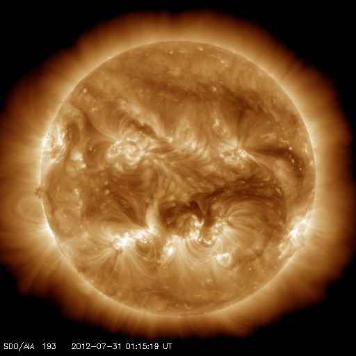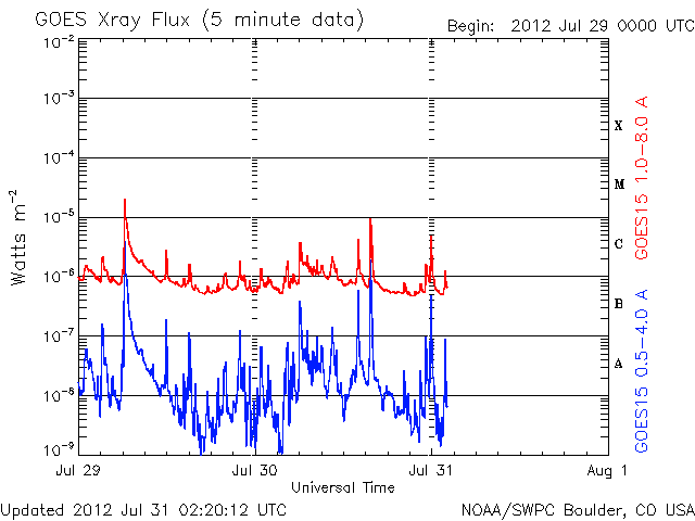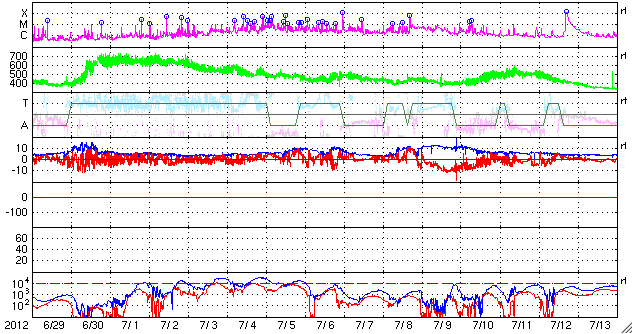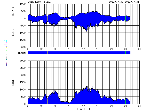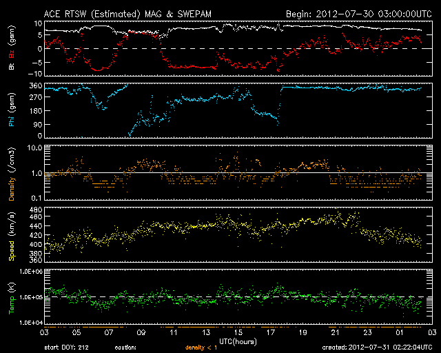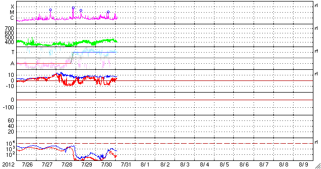 2012/ 7/31 11:22 更新 太陽風の磁場が南向きに強まり、磁気圏の活動が強まりました。太陽ではM1のフレアが発生しています。 担当 篠原 昨日のニュース以降も、太陽風の磁場はやや強まった状態が続きました。 現在まで、7〜9nTの間でゆっくりと変化しています。 磁場の南北成分を見ると、南向きに大きく振れて、 -7nTと強い南向きの状態が半日ほど発生しています。 太陽風の速度は、400km/秒から450km/秒に少し高まって、 再び400km/秒へ下がる変化をしています。 磁場が大きく南を向いた影響で、磁気圏の活動が強まり、 AE指数は1000nTを超える大きな変化をしました。 現在は、太陽風の磁場は、南向きから北向きに変わり、 磁気圏の変動も小さくなっています。 磁場の変化は一段落ついた様子ですが、 太陽風の磁場強度は、まだ少し強まった状態が続いているので、 再び南向きに振れると、磁気圏の活動も再び強まるでしょう。 29日のM6フレアによるCMEの影響が、 今夜から明日にかけてやって来る可能性があります。 Spaceweather.comの記事に動画が掲載されていますが、 日本時間で8月1日0時±7時間に到来という分析が、 Goddard Space Weather Labから発表されているそうです。 どうなるでしょうか。 やって来た場合も、太陽風の変化は小規模に留まるでしょう。 太陽では、昨夜、30日23時(世界時30日14時)に、南東の1532群でC8.8、 続いて、31日0時半(世界時30日15時半)に、となりの1536群でM1.1、 そして今朝、31日9時(世界時31日0時)に、南東の端でC6.3、 などのフレアと、この他にC1〜4のフレアが10回近く発生しています。 比較的小規模の現象ばかりですが、太陽のあちこちでにぎやかに発生しています。 東の端でも発生しているということは、 今後、こちら側に回ってくることになるので、 太陽の活動的な状態はしばらく続きそうです。 台風が接近しているためか、鹿児島では地上の風が強まっています。 予報によると、明日の夕方にすぐ近くを通過する様です。 ちょうどその時間帯に東京に飛ぶ予定なのですが・・・