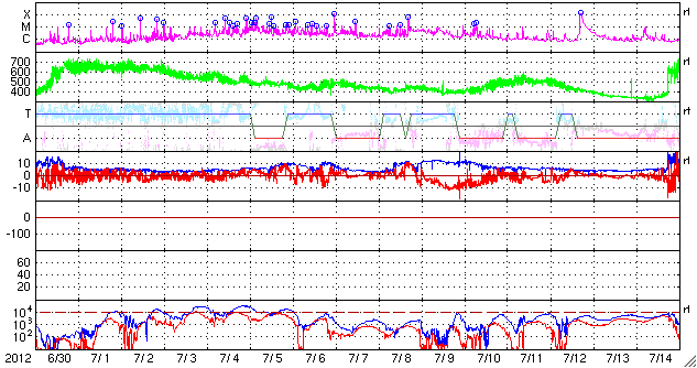 - 2012/ 7/30 12:42 M2.3の中規模フレアが発生しました。太陽風は平均的な速度で安定しています。