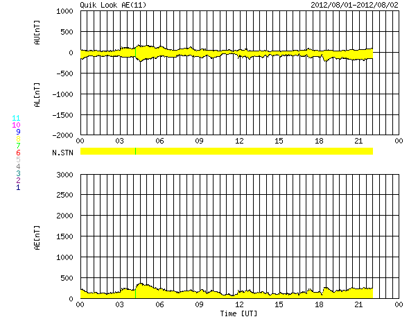 下段のAEグラフの値が高くなると、オーロラ活動が活発化しています。