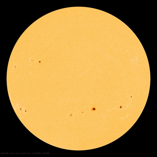 SDO衛星による太陽の可視光写真。マウスの矢印を写真に重ねると、黒点番号付きの写真に切り替わります。