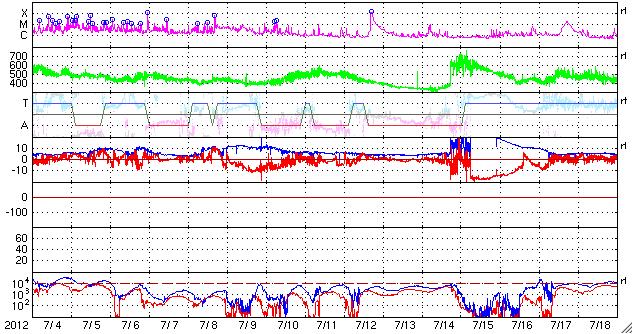 (c) NOAA/SWPC 、(動画加工 : 宇宙天気ニュース) ![]() SDO衛星のAIA304カメラによる、太陽の北東端で発生したC3.5フレアの様子。 (c) SDO (NASA)、 (動画加工 : 宇宙天気ニュース) ![]() SOHO衛星LASCO C2、C3カメラによる、太陽から南東寄りに噴き出して行くCME。 (c) SOHO (ESA & NASA)、 (動画加工 : 宇宙天気ニュース) ![]() SDO衛星のAIA193カメラによる太陽コロナの様子 (c) SDO (NASA) ![]() SDO衛星による太陽の可視光写真。マウスの矢印を写真に重ねると、黒点番号付きの写真に切り替わります。 (c) SDO (NASA) ![]() GOES衛星の太陽X線データ (c) NOAA/SWPC ![]() ACEが観測した太陽風の磁場(1番上の枠、白線は全体の強度、赤線は南北成分) および、太陽風の密度(3番目の橙線)、速度(4番目の黄線) (c) NOAA/SWPC ![]() リアルタイムAE指数 下段のAEグラフの値が高くなると、オーロラ活動が活発化しています。 (c) 京都大学, NICT ![]() 27日の太陽周期に合わせたデータプロット 太陽が同じ面を地球に向けていた27日前の変化から、今後を予想することができます。 (c) 作図:宇宙天気ニュース