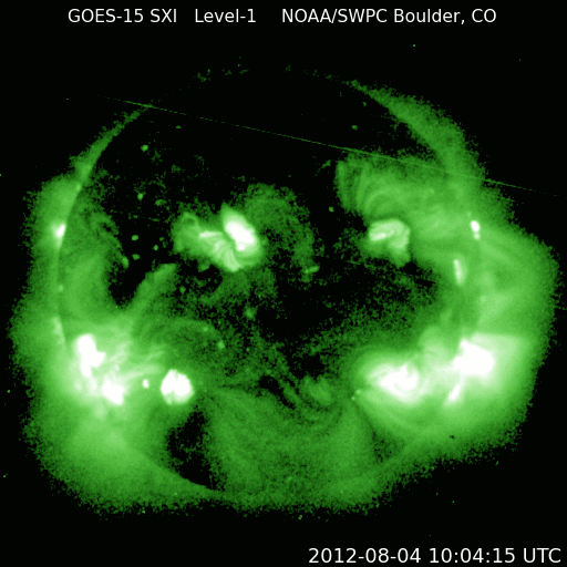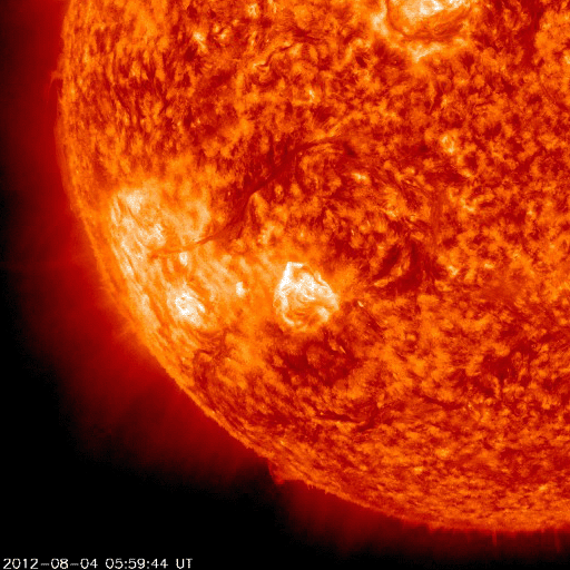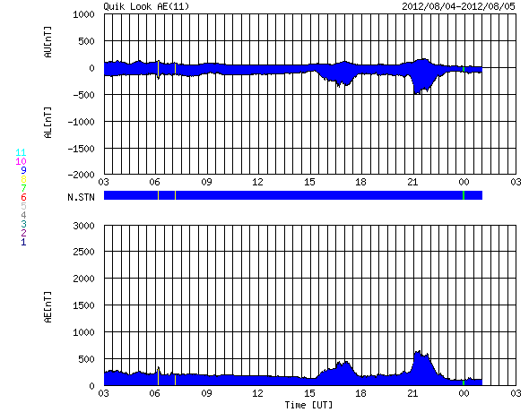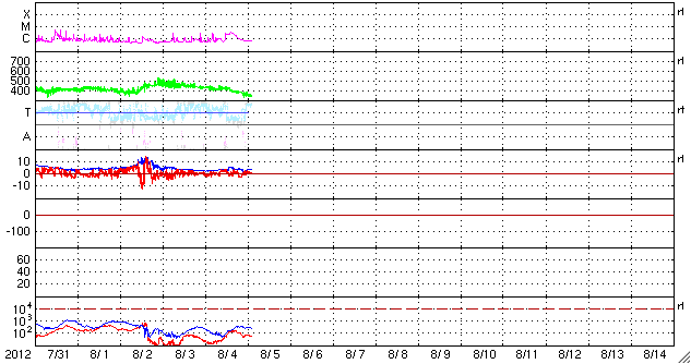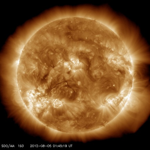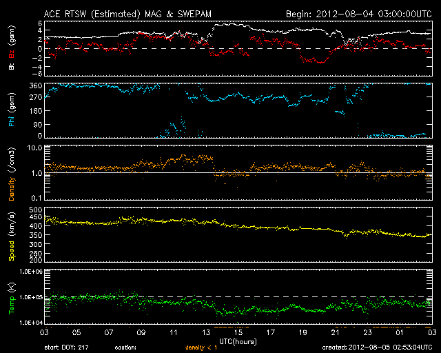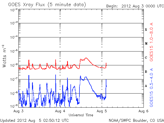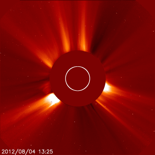 2012/ 8/ 5 11:54 更新 C3.5の小規模フレアが発生し、CMEも飛び出しています。太陽風は低速です。 担当 篠原 太陽の南東(左下)、1539黒点群でC3.5の小規模フレアが発生しました。 昨夜、4日20時(世界時4日11時)です。 X線のグラフを見ると、6時間以上にわたって変化が続いています。 この様子をGOES衛星やSDO衛星の写真で見ると、 1539黒点群の見える場所だけでなく、 その左右に大きく広がってフレアの変動が発生しています。 SDO衛星AIA304の動画は、実際の規模を考えるととても壮大です。 このフレアに伴って、CME(太陽ガスの放出現象)も発生しています。 SOHO衛星LASCOカメラの観測によると、 太陽から左下に向かって白いガスが噴き出しています。 地球からは斜め方向に噴き出していますが、 弱い影響が明後日くらいにやって来るかもしれません。 太陽では、この他にも1535群で C1〜2の小さなCクラスフレアが3回発生しています。 活動はこの後も見られそうです。 太陽風は、速度がゆっくりと下がって、 350km/秒と低速風に変わっています。 磁場強度も、3〜4nTと弱めの状態です。 太陽風は穏やかな風が続いています。 磁気圏も基本的には静かですが、 太陽風磁場の南向きに対応して、オーロラ活動の強まりが2回ほど、 AE指数で観測されています。 上記のCMEの影響を除くと、太陽風はこの後も穏やかな風が続くでしょう。 SDO衛星AIA193の太陽コロナ写真には、コロナホールは見えません。