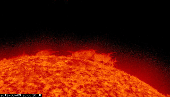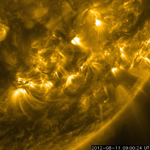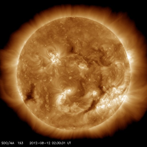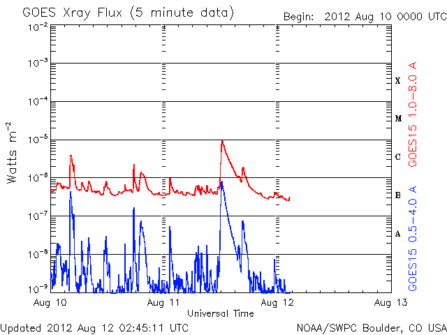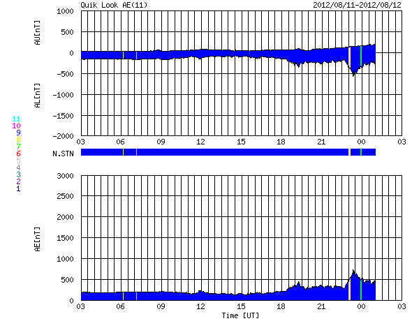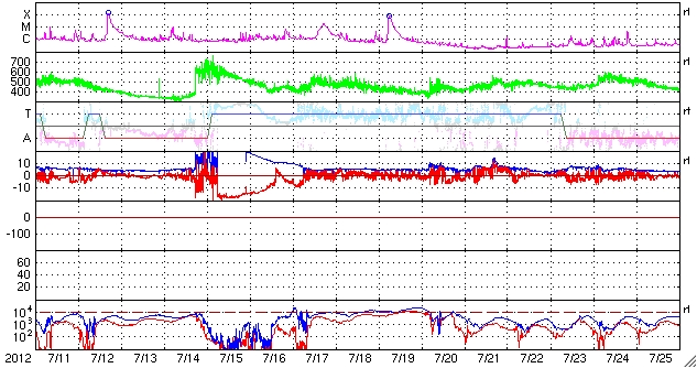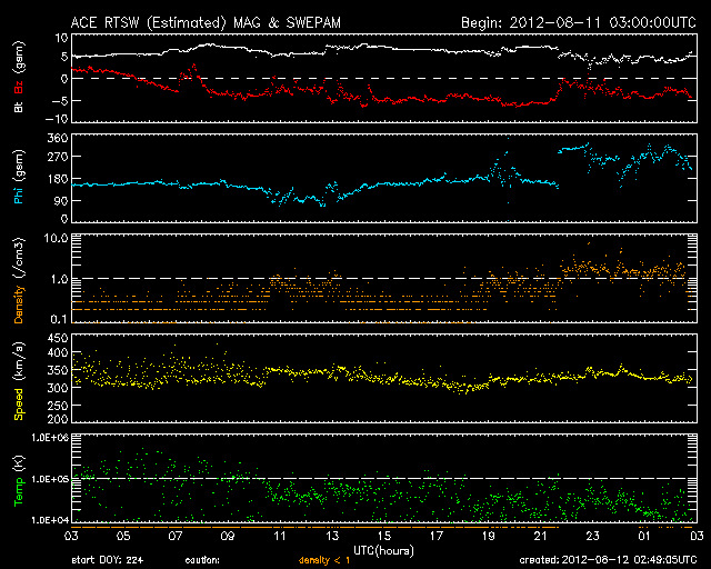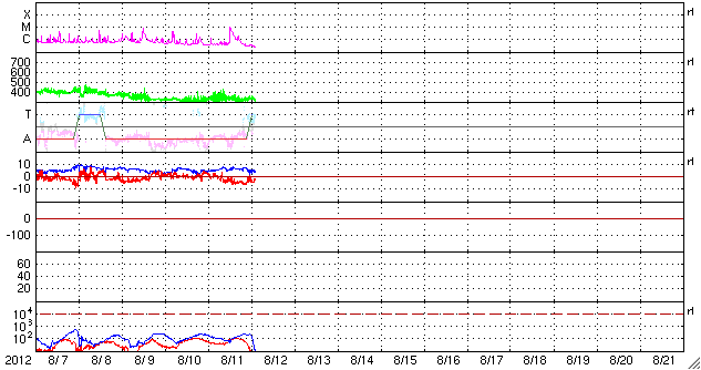 2012/ 8/12 11:50 更新 M1の中規模フレアが発生しました。太陽風は低速風で安定しています。 担当 篠原 昨夜、11日21時(世界時11日12時)に、 南西(右下)の端近くの1540でM1.0の中規模フレアが発生しました。 その様子を、SDO衛星AIA171の動画で紹介します。 このカメラでは、フレア後のポストフレアループの輝きがとてもきれいに見えます。 長時間型のフレアですが、CMEはあまり噴き出していない様です。 SOHO衛星の動画では弱いガスの広がりが見える程度でした。 太陽の活動は、全体としては下がっているようです。 M1以外のフレアは、C1とC2が1回ずつ発生した程度です。 X線グラフも、全体的な強度は低下しています。 10日から11日にかけて、太陽の北極付近で、 プロミネンスの美しい変動が起きていました。 SDO衛星AIA304の動画を掲載します。 最後にバランスが崩れて噴き上がって行く様子がとても雄大です。 太陽風は、330km/秒前後と低い速度で安定しています。 磁場強度は、5nT前後と平均的な大きさです。 太陽風磁場の南北成分は、-3nTと弱い南向きになっていますが、 速度も低いためか、磁気圏への影響は小さく、 AE指数はほとんど変化していません。 今朝、12日6時半(世界時1日21時半)に、 太陽風磁場の大まかな方向が切り替わる、セクター境界がやって来ました。 27日周期の図を見ると、「A」から「T」に切り替わっています。 しかし、太陽風には特に大きな変化はありませんでした。 太陽風は、今後も穏やかな状態が続きそうです。 今日は、「一日体験入学」として中学生対象のオープンキャンパスです。 未来の受験生(になって欲しい・・・)たちが、たくさん見学に来ています。 昨日に続いて夏休みらしく過ごしています。 ![]() SDO衛星AIA171カメラによる、M1.0フレアとポストフレアループの様子。 (c) SDO (NASA)、 (動画加工 : 宇宙天気ニュース) ![]() SDO衛星のAIA304カメラによる、太陽の北極付近のプロミネンスの活動。 (c) SDO (NASA)、 (動画加工 : 宇宙天気ニュース) ![]() SDO衛星のAIA193カメラによる太陽コロナの様子 (c) SDO (NASA) ![]() SDO衛星による太陽の可視光写真。マウスの矢印を写真に重ねると、黒点番号付きの写真に切り替わります。 (c) SDO (NASA) ![]() GOES衛星の太陽X線データ (c) NOAA/SWPC ![]() ACEが観測した太陽風の磁場(1番上の枠、白線は全体の強度、赤線は南北成分) および、太陽風の密度(3番目の橙線)、速度(4番目の黄線) (c) NOAA/SWPC ![]() リアルタイムAE指数 下段のAEグラフの値が高くなると、オーロラ活動が活発化しています。 (c) 京都大学, NICT ![]() 27日の太陽周期に合わせたデータプロット 太陽が同じ面を地球に向けていた27日前の変化から、今後を予想することができます。 (c) 作図:宇宙天気ニュース