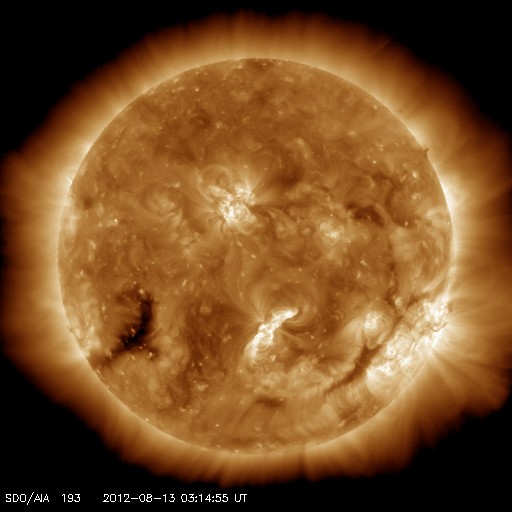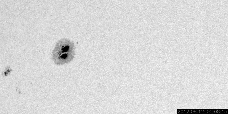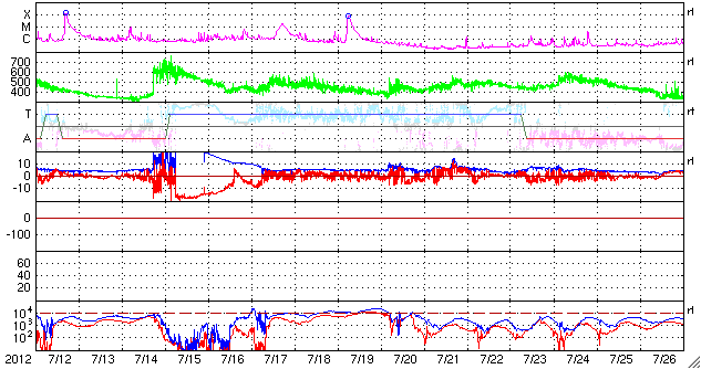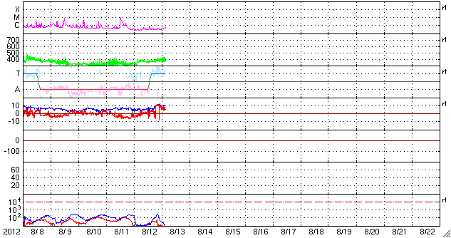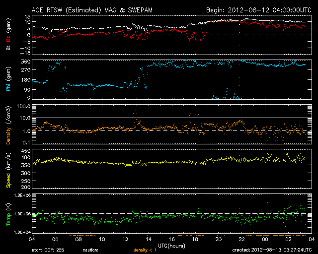 2012/ 8/13 12:28 更新 太陽は穏やかです。太陽風は磁場強度が少し上がっています。 担当 篠原 昨日から今日にかけて(世界時の8月12日)、Cクラス以上のフレアは発生しておらず、 太陽は穏やかになっています。 C以上のフレアが起きなかった日は、7月25日以来です。 太陽の黒点は、中央の1543黒点群が大きい程度で、その他は小さな黒点ばかりです。 その1543群の様子を、動画で紹介します。 拡大してみると、小さな変化はあちこちで起きています。 太陽のフレアは、このまま静かになるのか、ひと休みして活動を再開するのか、 磁場構造から見ると、1542群と1543群により可能性がありそうです。 太陽風は、昨日のニュースの後に速度が370km/秒ほどに上がり、 以降、そのままやや低速の状態が続いています。 一方、磁場強度は昨夜から高まって、10nTに強まっています。 前後の太陽風のデータを見ると、この辺りが本当のセクター境界だった様です。 それで、磁場の強まりなどが発生しているのでしょう。 地球の磁気圏への影響度を決める、太陽風磁場の南北成分は、 磁場が強まってから、ほとんど北向きに振れています。 このため、磁気圏への影響は小さく、AE指数は目立った変化は発生していません。 この後も、磁場の北向きが続くようなら、地球への影響は小さいでしょう。 南向きに反転すると、オーロラの活動が活発化します。
