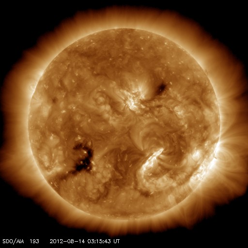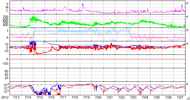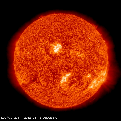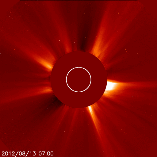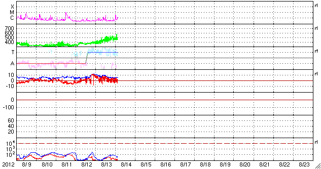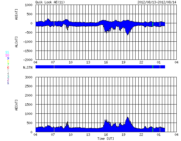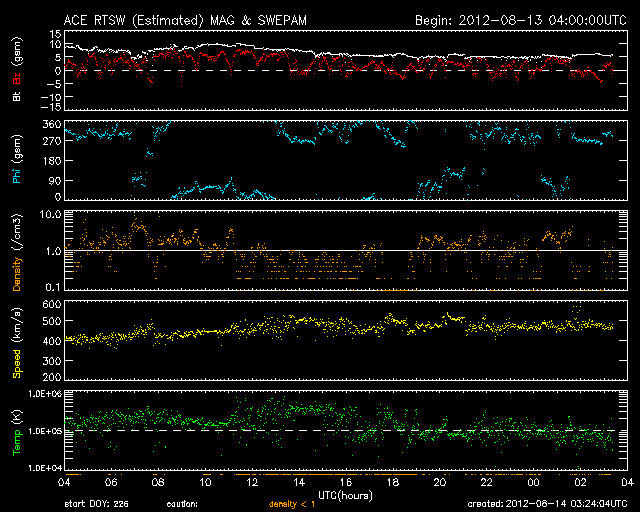 2012/ 8/14 12:25 更新 太陽風の速度がやや高速になっています。太陽ではCMEの噴出が発生しています。 担当 篠原 昨日のニュース以降、太陽風の速度はゆっくりと上昇し、 現在、480km/秒とやや高速の状態になっています。 一方、磁場強度は10nTから5nTヘゆっくりと下がっています。 地球は、弱い高速風領域に入っている様です。 磁場強度は5nTとまだ弱まってはいないため、 太陽風の速度はもう少し上昇するかもしれません。 太陽風磁場の南北成分は、0nTからプラス側(北向き)に振れています。 地球への影響は小さくなる振れ方ですが、 AE指数を見ると、500nTを超える大きさの変化が発生しています。 ただし、グラフ全体を見ると、一定の太さがずっと続いていて、 どこかにデータのエラーが含まれている様です。 指数全体の変化は少し小さめに見たほうが良さそうです。 太陽は、中央北寄りの1543黒点群で、 C1.0、C2.8、C3.5と小規模フレアの発生が続きました。 また、西の端(右端)でC1.4のフレアが発生しています。 このうち、西のC1.4と、1543群のC2.8に関係して、 太陽コロナの噴き上がりがSDO衛星AIA304によって撮影されています。 今日の1枚目の動画をご覧下さい。 西に向かっては明るいガスが(背景が暗いので)、 太陽の中央から北寄りに向かって暗いガスが(背景が明るいので) 噴き出すように写っています。 見え方は全然違いますが、どちらも素晴らしい光景です。 SOHO衛星LASCO C2、C3では、 CME(太陽ガスの放出現象)の広がる様子が観測されています。 2つめのCMEは、北向きに広く広がっているため、 淡くかなり見にくいです。 この様子では、地球方向にも向かっている可能性があります。 その場合、4日後の17日か18日くらいに太陽風の弱い乱れが到来しそうです。