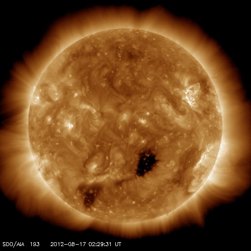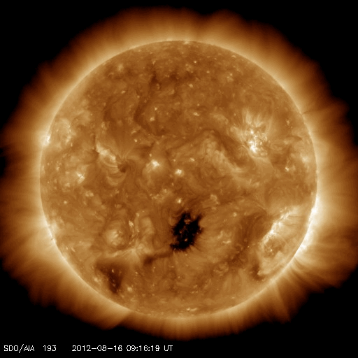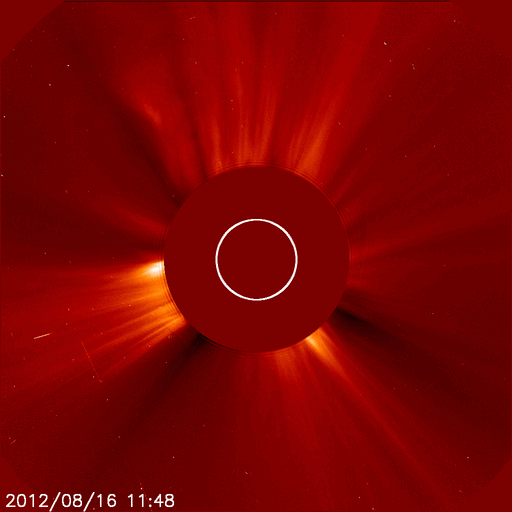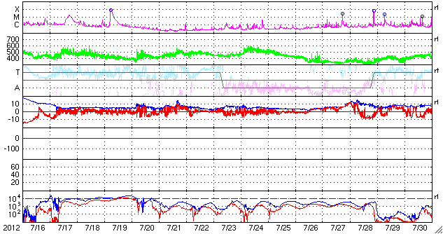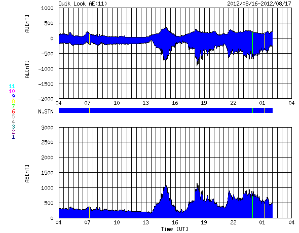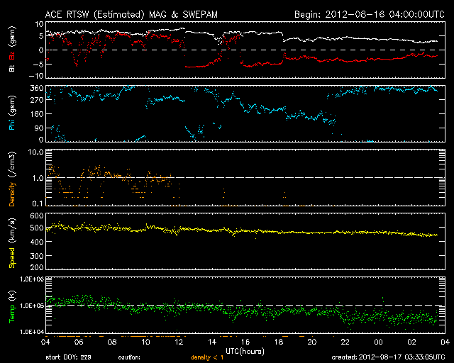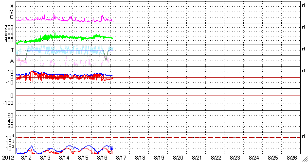 2012/ 8/17 12:32 更新 CMEの影響が到来して太陽風磁場が南向きになり、磁気圏活動が強まっています。 担当 篠原 太陽では、西にだいぶ傾いた1543黒点群で、 昨夜、16日22時(世界時16日13時)にC3.6の小規模フレアが発生しました。 SDO衛星AIA193の動画をご覧ください。 右上の広い範囲でコロナの動きが見えています。 GOES衛星のX線グラフが長時間変化するタイプのフレアで、 SOHO衛星LASCO C2、C3カメラでは、 太陽の北半球側に広く広がるCME(太陽ガスの放出現象)が見えています。 1543群では、3日前、昨日と、3回連続で同じような現象を紹介しています。 昨日に比べると、フレアの規模は大きく、 CMEの噴き出す様子もはっきりと捉えられています。 フレアは西に傾いた地点で発生していますが、 CMEは幅広く広がっていることから、 地球へも影響がやって来る可能性があります。 20日くらいになるでしょうか。 太陽風は、昨夜、16日21時(世界時16日12時)過ぎに、 磁場の南北成分が急に南向きに強まり、 -6nTほどに振れました。 以降、南向きに偏った状態が半日にわたって続いています (途中、途切れた時間帯もありますが)。 14日のニュースでお知らせしたCMEの影響がやって来たのでしょう。 太陽風の速度は500km/秒と高速の状態が続いていて、 3日間で地球に到来するのはちょうどよいタイミングです。 この影響で、AE指数は800〜1000nTに達する活発な活動が 半日にわたって観測されています。 極域ではきれいなオーロラが見えているのではないかと思いますが、 昭和基地のカメラは最新データがありませんでした。 現在の太陽風の磁場強度は、3nTと弱まっています。 磁気圏への影響は、この後は小さくなりそうです。 SDO衛星AIA193を見ると、コロナホールは太陽の中心線を越え、 西側に移動しています。 西側に半分ほど移動した頃が、高速風が地球にやって来る目安です。 太陽風の変化は、明後日、19日頃にやって来そうです。 ![]() SDO衛星のAIA193カメラによる、1543群のC3.6小規模フレア。 (c) SDO (NASA)、 (動画加工 : 宇宙天気ニュース) ![]() SOHO衛星LASCO C2、C3カメラによる、太陽の北寄りに噴き出すCME。 (c) SOHO (ESA & NASA)、 (動画加工 : 宇宙天気ニュース) ![]() SDO衛星のAIA193カメラによる太陽コロナの様子 (c) SDO (NASA) ![]() SDO衛星による太陽の可視光写真。マウスの矢印を写真に重ねると、黒点番号付きの写真に切り替わります。 (c) SDO (NASA) ![]() GOES衛星の太陽X線データ (c) NOAA/SWPC ![]() ACEが観測した太陽風の磁場(1番上の枠、白線は全体の強度、赤線は南北成分) および、太陽風の密度(3番目の橙線)、速度(4番目の黄線) (c) NOAA/SWPC ![]() リアルタイムAE指数 下段のAEグラフの値が高くなると、オーロラ活動が活発化しています。 (c) 京都大学, NICT ![]() 27日の太陽周期に合わせたデータプロット 太陽が同じ面を地球に向けていた27日前の変化から、今後を予想することができます。 (c) 作図:宇宙天気ニュース