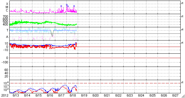 2012/ 8/19 08:01 更新 北東端の黒点群はフレア活動を続けています。太陽風はコロナホールの影響が始まりそうです。 担当 篠原 太陽の北東から現れた新しい黒点群は、1548黒点群と番号が付きました。 掲載の可視光写真は、昨日の午後の撮影で、 現在はもう少し顔を出していると思います。 活発なフレア活動は続いていて、 昨日のニュース以降も、18日23時(世界時18日14時)にC7.3、 19日1時(世界時18日16時)にM2.0、 その他にもC1〜2のフレアを多数起こしています。 X線のグラフとしては、1日前ころがピークで、 その後少し下がっている印象ですが、 ひと休みして再び活発化することはよく見られるので、 引き続き注目してください。 ただし、黒点の規模はそれほど大きくはない様で、 NOAA/SWPCの予報では、Xクラスに達するフレアの可能性は低い様です。 太陽風は、昨日、磁場強度が6〜7nT程度にやや上がっていましたが、 今日に入って更に上がり、10〜15nTに強まっています。 コロナホールの影響が及び始めたのかもしれません。 太陽風の速度は400km/秒と平均的な速さです。 コロナホールによる速度上昇がこれから始まるかもしれません。 太陽風磁場の南北成分は、現在は北向きになっていますが、 磁場強度が強まっていることと、今後速度が高まった場合、 南向きに振れてオーロラ活動が強まる可能性があります。 昨夜も、一時的に磁場が南に振れて、 AE指数が700nTくらいに強まる変化が見られています。
