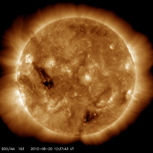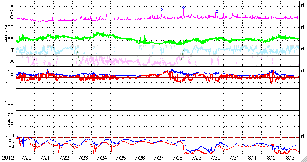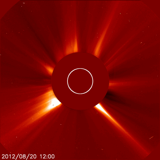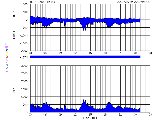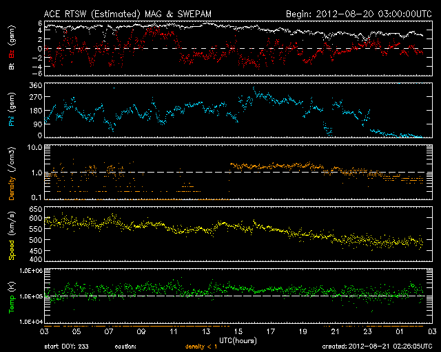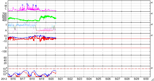 2012/ 8/21 11:27 更新 太陽は穏やかです。太陽風の速度は下がり始め、高速風は終わりつつあります。 担当 篠原 太陽のフレア活動はすっかり静かになり、 フレアは、昨日の午後にBクラスの小さな変化が起きたのが最後です。 SDO衛星の可視光写真を見ると、1548黒点群は小さく、 活発な活動は終わってしまったようです。 今日の太陽は、北半球側に、1548群、1546群、新黒点、1547群と、 4つの黒点群が斜めにきれいに一列に並んでいます。 SOHO衛星LASCO C2、C3カメラによると、 太陽の北に向かって、きれいな形をしたCMEが噴き出しています。 STEREO衛星で調べると、 太陽の裏側で起きたフィラメントの噴出によるCMEです。 地球への影響はありません。 太陽風は、昨日いっぱい550〜570km/秒の高速風が安定して続いていましたが、 今日に入った頃から速度が下がり始め、 現在は480km/秒と高速状態が終わりつつあります。 磁場強度も、速度と同じ様に下がり始めて、 現在は3nTと弱くなっています。 コロナホールの影響を抜け出して、太陽風は通常の状態に戻りそうです。 磁気圏のオーロラ活動は、太陽風磁場が南北に振れていた影響で、 AE指数で500〜700nT程度の変化が頻繁に起きていました。 しかし、現在は磁場強度が弱まり、速度も下がっていることから、 磁気圏も穏やかになっていくでしょう。 今日の鹿児島は、曇っていることもありますが、 風がいつもより涼しくなっています。 セミの鳴き声はにぎやかですが、秋が近づいている様です。 学校の夏休みは、始まってまだ10日なのですが。 ![]() SOHO衛星LASCO C2、C3による、太陽の北へ噴き出すCME。 (c) SOHO (ESA & NASA)、 (動画加工 : 宇宙天気ニュース) ![]() SDO衛星のAIA193カメラによる太陽コロナの様子 (c) SDO (NASA) ![]() SDO衛星による太陽の可視光写真。マウスの矢印を写真に重ねると、黒点番号付きの写真に切り替わります。 (c) SDO (NASA) ![]() GOES衛星の太陽X線データ (c) NOAA/SWPC ![]() ACEが観測した太陽風の磁場(1番上の枠、白線は全体の強度、赤線は南北成分) および、太陽風の密度(3番目の橙線)、速度(4番目の黄線) (c) NOAA/SWPC ![]() リアルタイムAE指数 下段のAEグラフの値が高くなると、オーロラ活動が活発化しています。 (c) 京都大学, NICT ![]() 27日の太陽周期に合わせたデータプロット 太陽が同じ面を地球に向けていた27日前の変化から、今後を予想することができます。 (c) 作図:宇宙天気ニュース