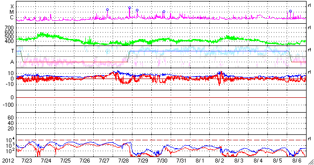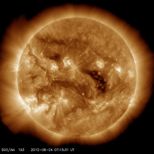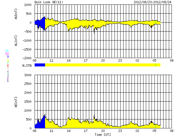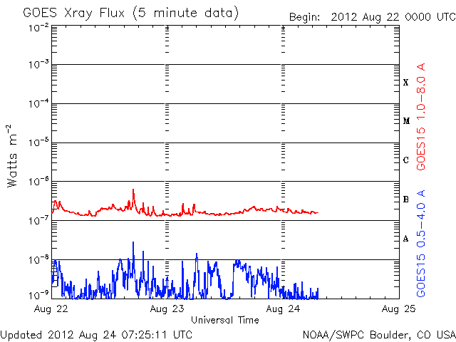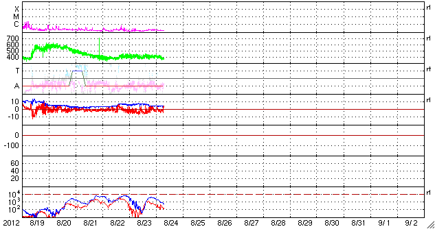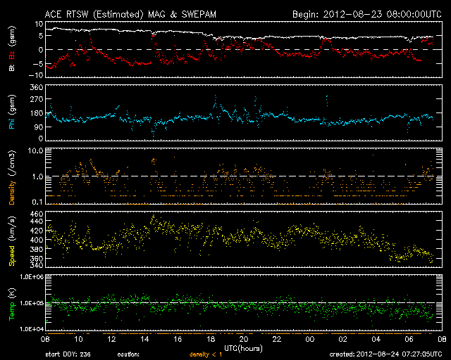 2012/ 8/24 16:28 更新 太陽風は穏やかです。明日くらいから高速風が始まりそうです。 担当 篠原 太陽は目立ったフレアはなく、 穏やかな状態が続いています。 X線のグラフはほとんど変化していません。 黒点群はぼつぼつとあるのですが、 活動度は低い様です。 太陽風も平均的な状態で安定しています。 速度は、380〜420km/秒、 磁場強度は、5nTと、 昨日からほとんど変化ありません。 太陽風磁場の南北成分は、 振幅は小さいですが、南寄りになっています。 このため、磁気圏では弱い活動が続いていて、 AE指数は小さな変化が続いています。 コロナホールは、太陽の中心線を過ぎて、 右側にせり出しています。 明日、25日くらいから太陽風の速度が上がって、 高速風が始まりそうです。 今日まで湘南で出前授業でした。 かなり忙しくて、更新が遅くなってしまいました。 青空に向かって水ロケットを打ち上げたり、 楽しい夏休みでした。