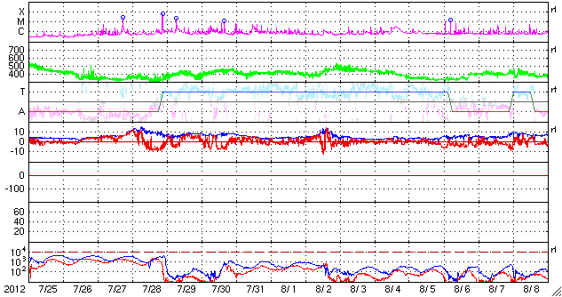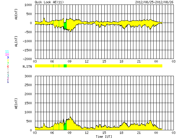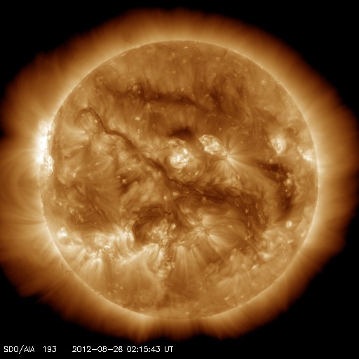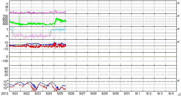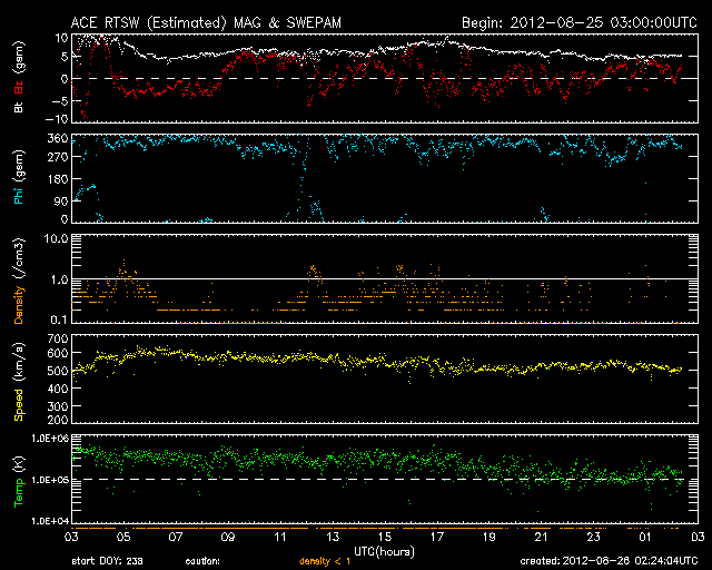 2012/ 8/26 11:25 更新 高速の太陽風が到来し、500km/秒台の太陽風が続いています。 担当 篠原 昨日のニュースの直後、25日11時(世界時25日2時)過ぎから、 太陽風の速度は上昇を始め、 25日15時(世界時25日6時)頃に600km/秒に達しました。 コロナホールによる高速風が始まりました。 速度が上がるとともに、磁場強度は5nT前後に下がっています。 しかし、今回の高速太陽風はあまり勢いがなく、 速度が上がるとすぐに下がり始めて、半日ほどで500km/秒まで下がり、 以降は500〜530km/秒で推移しています。 SDO衛星AIA193で見えていたコロナホールは それほど大きくはなかったので、 高速風領域がこの程度の規模なのは妥当と言えるかもしれません。 今日いっぱい高速状態が続いて、 明日くらいからは通常の太陽風に戻っているかもしれません。 AE指数は、500nT前後の変化が発生してやや活発という程度です。 太陽風の速度は上がりましたが、 磁場の南北成分は0nT付近で小さく変化しているだけで、 磁気圏へのエネルギーの流れ込みは大きくなりませんでした。 太陽は、中央の1554黒点群で、C1.7の小規模フレアが発生した程度で、 穏やかな状態が続いています。 1554群の規模はやや縮まっている感じも受けます。 東の端から現われた黒点群は、1555群と番号が付きました。 この群も特にフレアは起こしていません。 この向こうから別の活動領域が姿を現しそうです。 今日のSDO衛星AIA193の太陽コロナ写真を見ると、 太陽の北東端(左上)から、太陽の中心を通って南西(右下)へ、 ダークフィラメント(黒く細い筋)が延々と伸びているのが印象的です。 ![]() SDO衛星のAIA193カメラによる太陽コロナの様子 (c) SDO (NASA) ![]() SDO衛星による太陽の可視光写真。マウスの矢印を写真に重ねると、黒点番号付きの写真に切り替わります。 (c) SDO (NASA) ![]() ACEが観測した太陽風の磁場(1番上の枠、白線は全体の強度、赤線は南北成分) および、太陽風の密度(3番目の橙線)、速度(4番目の黄線) (c) NOAA/SWPC ![]() リアルタイムAE指数 下段のAEグラフの値が高くなると、オーロラ活動が活発化しています。 (c) 京都大学, NICT ![]() 27日の太陽周期に合わせたデータプロット 太陽が同じ面を地球に向けていた27日前の変化から、今後を予想することができます。 (c) 作図:宇宙天気ニュース
