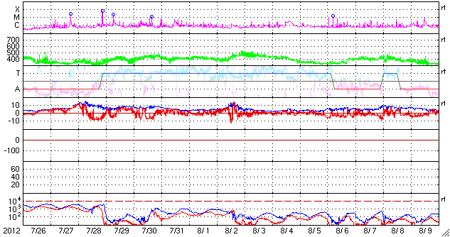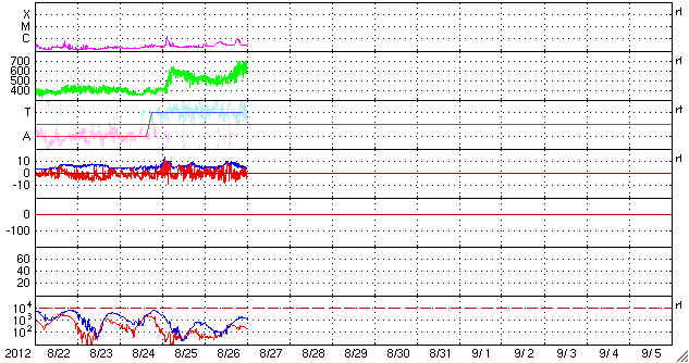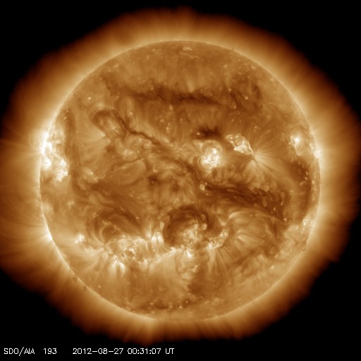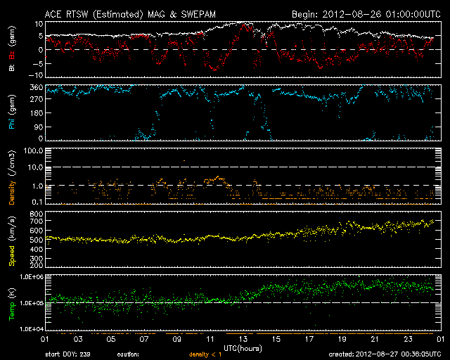 2012/ 8/27 09:32 更新 太陽風の速度が再び上昇し、660km/秒の高速風になっています。 担当 篠原 太陽風の速度が再度上昇し、 660km/秒と一段高い速度に上がっています。 昨日、26日20時(世界時26日11時)頃から、 太陽風の磁場強度が5nTから10nTに強まり、 それを追いかけるように速度も上昇を始め、 半日ほどかけて、500km/秒から660km/秒へ高まりました。 強まった磁場強度は、6時間ほどで下がり始め、 現在は5nTと元のレベルに戻っています。 今回の高速風は、2段階の山になっていました。 高い速度の太陽風は、もうしばらく続くことになりそうです。 今回の太陽風変化の影響で、 磁気圏のオーロラ活動もある程度強まっています。 AE指数のグラフでは、700nTの中規模の変動が発生しています。 太陽風が強まっているので、 磁場が南向きに振れれば、 この後も小中規模のオーロラ活動が続く可能性があります。 太陽は、27日2時(世界時16日17時)頃に、 東端の少し向こう側で、C1.0の小規模フレアが起きています。 実際には、もう一段大きな規模だったと思われます。 目立った活動はこれくらいで、 太陽のこちら側に見えている黒点群は穏やかです。 ![]() SDO衛星のAIA193カメラによる太陽コロナの様子 (c) SDO (NASA) ![]() SDO衛星による太陽の可視光写真。マウスの矢印を写真に重ねると、黒点番号付きの写真に切り替わります。 (c) SDO (NASA) ![]() ACEが観測した太陽風の磁場(1番上の枠、白線は全体の強度、赤線は南北成分) および、太陽風の密度(3番目の橙線)、速度(4番目の黄線) (c) NOAA/SWPC ![]() リアルタイムAE指数 下段のAEグラフの値が高くなると、オーロラ活動が活発化しています。 (c) 京都大学, NICT ![]() 27日の太陽周期に合わせたデータプロット 太陽が同じ面を地球に向けていた27日前の変化から、今後を予想することができます。 (c) 作図:宇宙天気ニュース
