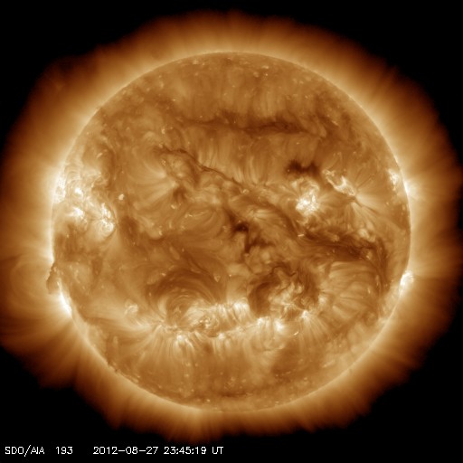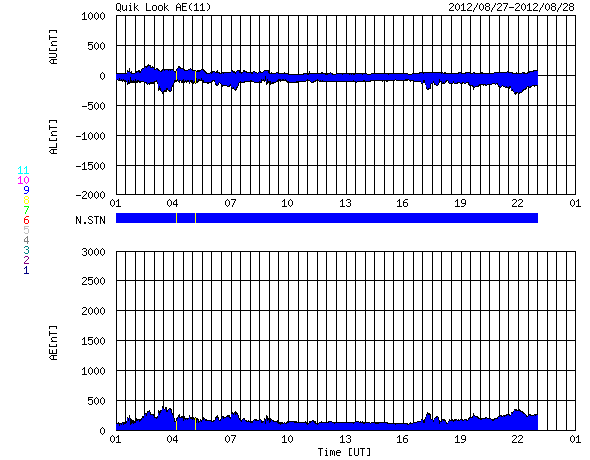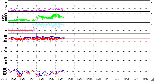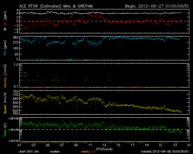 2012/ 8/28 09:01 更新 太陽風の速度は下がりつつあります。太陽の活動も穏やかです。 担当 篠原 高速の太陽風は終わりに近付いている様です。 昨夜、27日22時(世界時27日13時)頃まで、 600km/秒台と高い速度が続いていましたが、 その後低下が始まり、今朝になって500km/秒を割りつつあるところです。 磁場強度も4nTとやや弱めの状態になっていて、 高速太陽風の領域は通り過ぎようとしています。 太陽風磁場の南北成分は0nT付近で変化しています。 強度が下がっていることもあり、大きく振れることもありませんでした。 このため、磁気圏は穏やかで、 AE指数のグラフは小さな変化が時々見られる程度でした。 太陽では、1556、1557、1558と3つの黒点群が新しく現われました。 しかし、どれも小さな黒点で、 掲載の可視光写真ではほとんど見つけることができません。 フレアの活動は、Bクラスの小さな変化があちこちで起きていますが、 特に大きくなる様子は、今のところ見られません。