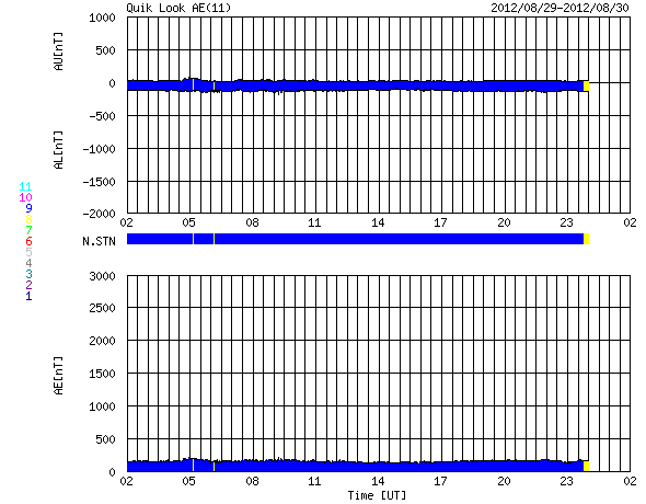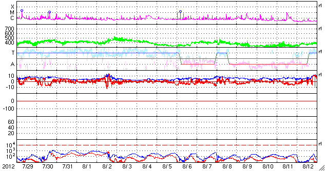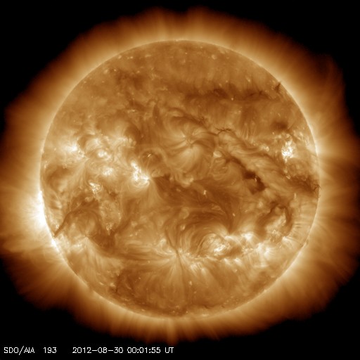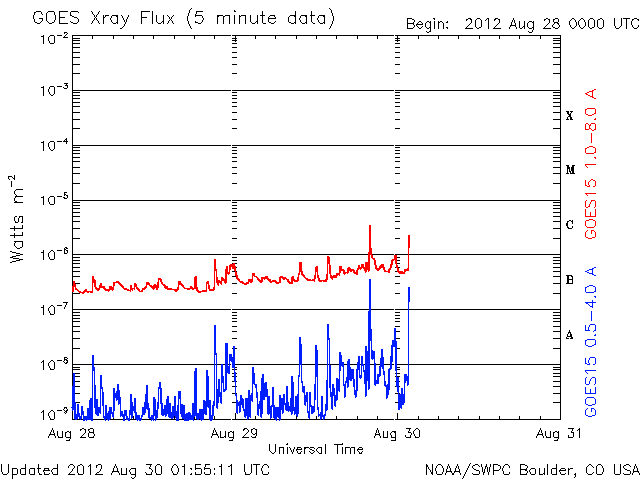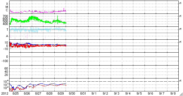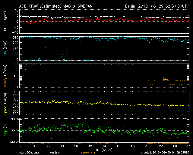2012/ 8/30 10:59 更新 太陽の東端でCクラスのフレアが発生しました。太陽風、磁気圏は穏やかです。 担当 篠原 太陽の南東(左下)から、新しく活動的な領域が近づいています。 昨夜、29日22時半(世界時29日13時半)にC1.0、 今朝、30日5時(世界時29日20時)にC4.0と、 2つのCクラスフレアが観測されています。 太陽の端で起きているため、 実際の規模はこれよりも大きかった可能性があります。 10日ほど静かになっていた太陽の活動が、 これからある程度活発になったりするでしょうか。 また、ちょうど今、30日10時半(世界時30日1時半)に、 C3のフレアが発生しています。 発生地点はまだ分かりません。 太陽風の速度は、 昨日のニュース以降ゆっくりと低下を続けています。 現在は430km/秒ほどで、平均的な速度にほぼ下がっています。 磁場強度も3nTとやや弱まっています。 SDO衛星AIA193には、特にコロナホールは見られません。 今後、太陽風は穏やかな状態が続くと思われます。 磁気圏も静穏です。 AE指数のグラフは全く変化していません。