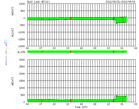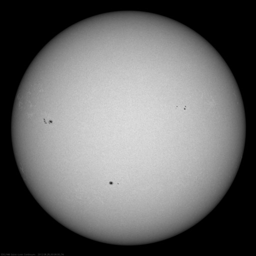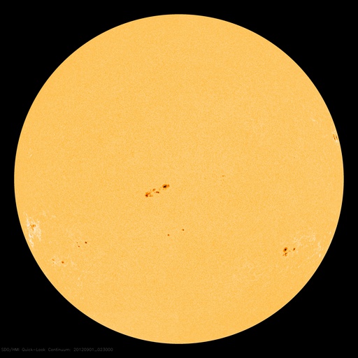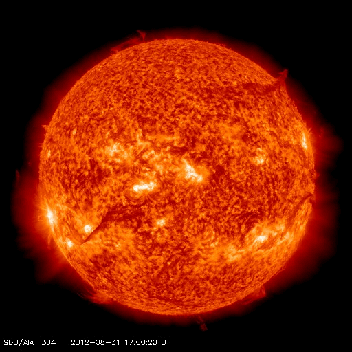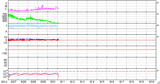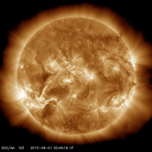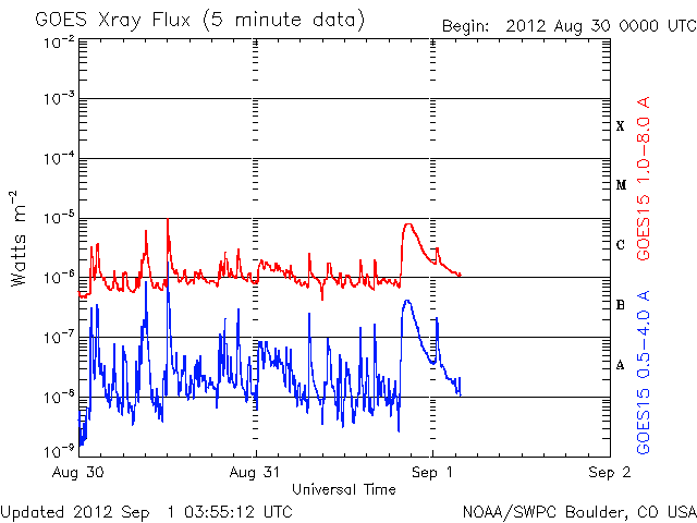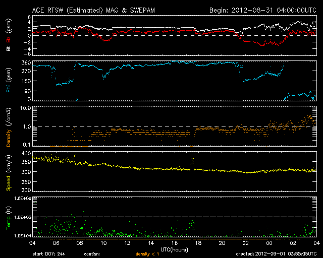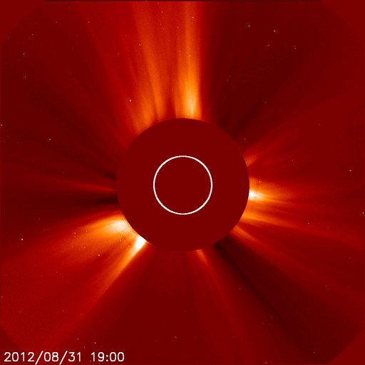 2012/ 9/ 1 12:56 更新 C8.4の小規模フレアが発生し、激しいCMEを起こしています。動画をご覧ください。 担当 篠原 太陽の黒点が全体的に更に目立ってきました。 南西の1553黒点群、中央の1560群の大きさが増し、 南東には1562群、1563群、そして、端から1564群が姿を現しました。 28日からの4日間の黒点の様子を、早送りの動画でご覧ください。 いくつもの黒点群が連動するように姿を変えて行く様子が印象的です。 そして、南西部の新しい領域の1562群で、 今朝、9月1日5時(世界時8月31日20時)にC8.4の小規模フレアが発生しました。 X線強度の変化としては特に大きくはありませんが、 激しいコロナの噴出を伴っています。 GOES衛星のX線カメラ、SDO衛星AIA304の動画でフレアの様子を紹介します。 AIA304の動画では、この領域に横たわっていたダークフィラメントが、 フレアと供に激しく噴き上がって行く様子が見えています。 SOHO衛星LASCO C2、C3では、太陽全体を包むように広がって見える、 フル・ハローのCMEになっています。 発生地点は地球からは斜め方向ですが、 この噴出の様子では、太陽風の乱れは地球へも到来するでしょう。 地球まで3日後前後と考えると、9月4日頃と予想されます。 太陽では、この他にも小規模のフレアが活発に発生しています。 中央の1560群、同じく南東の1562群、1564群などで、 C1〜2のフレアが7回発生しています。 今後の活動にも注目してください。 太陽風は、速度が300km/秒にまで下がり、 かなり低速の風になっています。 磁場強度は、3〜4nTと弱めの状態が続いています。 磁気圏も静穏で、AE指数は全く変化がありません。 太陽風は今日のCMEによる擾乱がやって来るまで、 低速の穏やかな状態が続くでしょう。 ![]() SDO衛星の可視光写真による、4日間の太陽黒点の変化。 (c) SDO (NASA)、 (動画加工 : 宇宙天気ニュース) ![]() GOES-15衛星のX線カメラによるC8.4フレアの様子。 (c) NOAA/SWPC 、(動画加工 : 宇宙天気ニュース) ![]() SDO衛星のAIA304による、C8.4フレアとコロナガスの噴出。 (c) SDO (NASA)、 (動画加工 : 宇宙天気ニュース) ![]() SOHO衛星LASCO C2、C3カメラによるCMEの様子。 (c) SOHO (ESA & NASA)、 (動画加工 : 宇宙天気ニュース) ![]() SDO衛星のAIA193カメラによる太陽コロナの様子 (c) SDO (NASA) ![]() SDO衛星による太陽の可視光写真。マウスの矢印を写真に重ねると、黒点番号付きの写真に切り替わります。 (c) SDO (NASA) ![]() GOES衛星の太陽X線データ (c) NOAA/SWPC ![]() ACEが観測した太陽風の磁場(1番上の枠、白線は全体の強度、赤線は南北成分) および、太陽風の密度(3番目の橙線)、速度(4番目の黄線) (c) NOAA/SWPC ![]() リアルタイムAE指数 下段のAEグラフの値が高くなると、オーロラ活動が活発化しています。 (c) 京都大学, NICT ![]() 27日の太陽周期に合わせたデータプロット 太陽が同じ面を地球に向けていた27日前の変化から、今後を予想することができます。 (c) 作図:宇宙天気ニュース