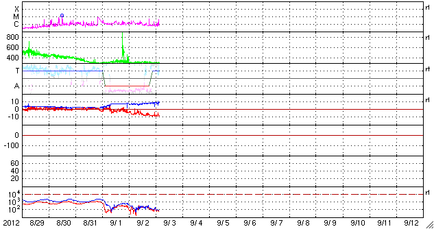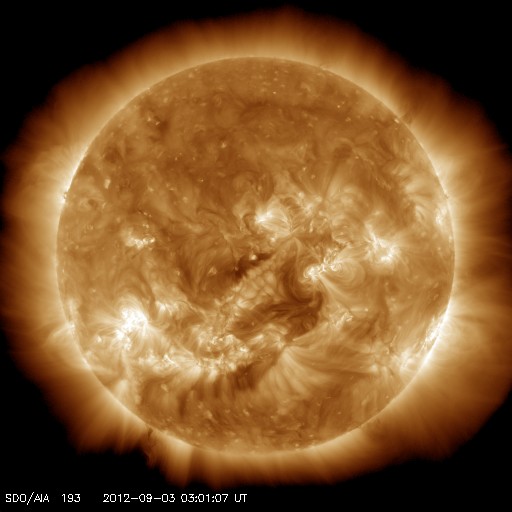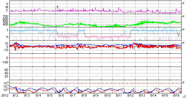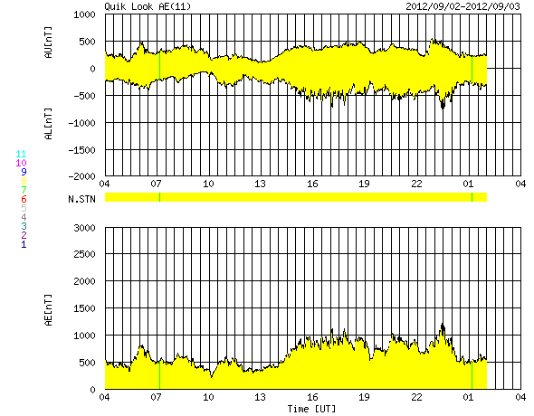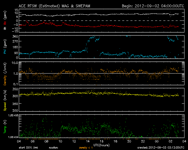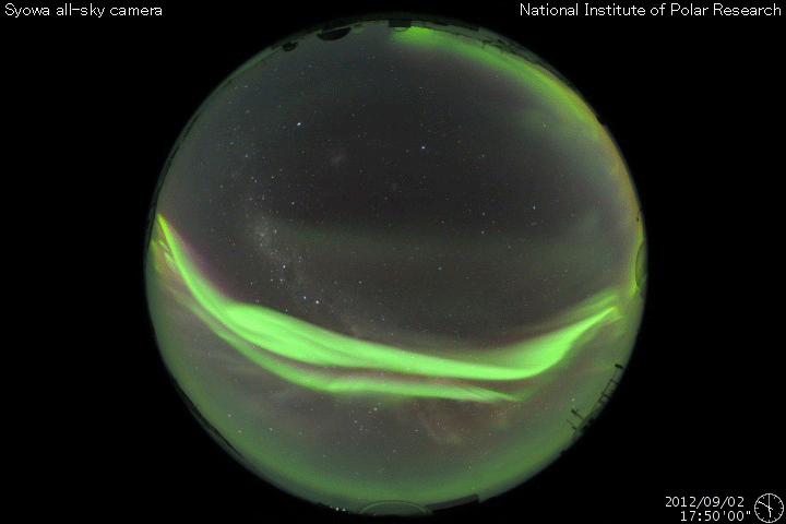 2012/ 9/ 3 12:12 更新 太陽風磁場の南向きが長時間続き、磁気圏活動が強まっています。 担当 篠原 太陽風は、300〜320km/秒と低速の風が続いていますが、 磁場強度が6〜9nTと強まった状態になっています。 特に、磁場の南北成分が南向きに振れ続け、 -5nTから-8nTとまとまった南向きの状態が1日以上続いています。 この影響で、磁気圏の活動が強まっています。 AE指数は、500nTから1000nTの変動が連続して発生しています。 南極の昭和基地では、オーロラの美しい活動が 全天カメラで撮影されています。 世界時2日17〜18時頃の様子を動画で紹介します。 今日のオーロラは10秒間隔で撮影されています(普段は30秒間隔)。 そのため、普段ここで紹介している動画よりも 滑らかにオーロラの動きを見ることができます。 動画を眺めていて、臨場感が普段とは明らかに違います。 京都大学WDCによると、Dst指数は-50nTくらいの減少(発達)になっていて、 小規模の磁気嵐が発生している様です。 太陽風の速度が遅いこともあり、磁気圏擾乱の規模は激しくはありません。 27日周期で以前のデータを振り返ると、 この期間には、太陽風の磁場強度が強まる傾向がある様です。 今回の変化も、その傾向の繰り返しによるものかもしれません。 続いて、明日くらいに、1日に発生したCMEの影響が到来しそうです。 今日と同様に、太陽風の変動によって磁気圏活動が活発になる可能性があります。 太陽は、Cクラスのフレアが数回発生し、 激しくはありませんが、活動的な状態が続いています。 1560黒点群や1564群などは、黒点も大きく、 この後も、CクラスやMクラスのフレアが続きそうです。 太陽放射線は、現在も高まった状態が続いています。 明日から13日まで、観測活動のためペルーに行きます。 首都リマの北にあるアンコン観測所に 新しい観測装置を設置するための準備です。 明後日以降は、記事の更新が難しくなると思います。