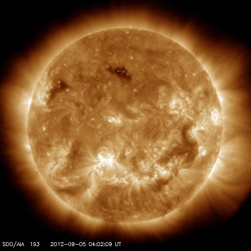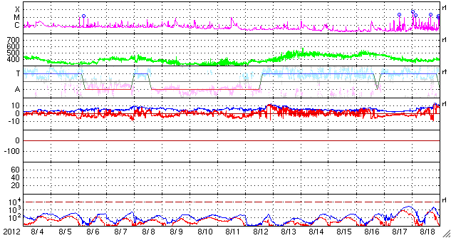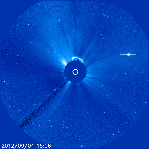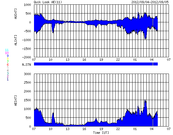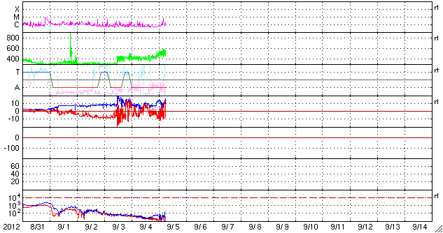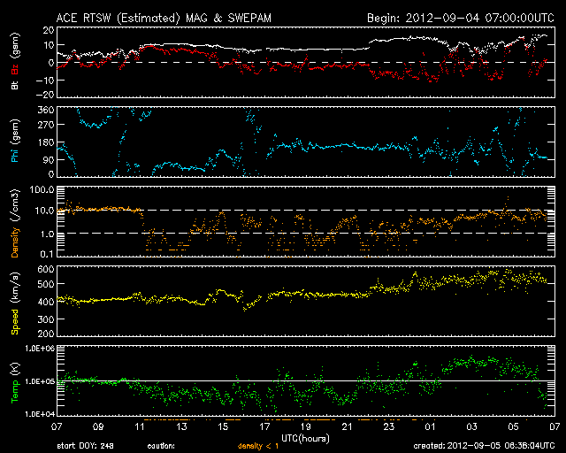 2012/ 9/ 5 15:39 更新 太陽風の磁場が南向きに強まり、オーロラの活動が強まりました。太陽風は高速風になっています。 担当 篠原 太陽風は、今朝、5日7時(世界時4日22時)に、また新しい乱れがやって来て、 磁場強度は再び15nT近くに強まり、 速度は530km/秒に上がっています。 特に、磁場の南北成分が南向きに強まり、 -5nTを超えるくらいのまとまった南向きが数時間続きました。 このため、磁気圏の活動が活発になり、 AE指数で1000〜1500nTの大きな変動が発生しています。 極域では、激しいオーロラが見えていたのではないでしょうか。 現在の磁場は、0nT付近から、やや北寄りに変わっているようで、 このままならオーロラの活動は落ち着きそうです。 しかし、磁場強度はまだ15nTと強く、 速度も500km/秒台を超えていることから、 今後、再び南寄りに切り替わると、オーロラも激しくなるでしょう。 太陽は、今日の昼、5日12時半(世界時5日3時半)に、 中央から少し南の1564黒点群でC6.1の小規模フレアが発生し、 この他にも、1564群と1565群でC1〜2のフレアが数回発生しています。 この後も同程度の活動が続きそうです。 4日18時(世界時4日9時)頃に、太陽の北西端で大きなフィラメントの噴出が発生しています。 SDO衛星AIA304の動画をご覧ください。 この噴出は、SOHO衛星LASCO C3でもCMEとして見えています。 上に向かっているので、地球への影響はありませんが、 なかなか見事な現象です。 先ほど、現地で4日の深夜にリマに着きました。 とても小さいホテルに入ったのですが、 Wi-Fiのサービスがあったので、リマ滞在中は更新できそうです。 夜のリマは少し寒いです。 ![]() SDO衛星AIA304による、太陽の北西端のフィラメント噴出。 (c) SDO (NASA)、 (動画加工 : 宇宙天気ニュース) ![]() SOHO衛星LASCO C3によるCMEの様子。 (c) SOHO (ESA & NASA)、 (動画加工 : 宇宙天気ニュース) ![]() SDO衛星のAIA193カメラによる太陽コロナの様子 (c) SDO (NASA) ![]() SDO衛星による太陽の可視光写真。マウスの矢印を写真に重ねると、黒点番号付きの写真に切り替わります。 (c) SDO (NASA) ![]() ACEが観測した太陽風の磁場(1番上の枠、白線は全体の強度、赤線は南北成分) および、太陽風の密度(3番目の橙線)、速度(4番目の黄線) (c) NOAA/SWPC ![]() リアルタイムAE指数 下段のAEグラフの値が高くなると、オーロラ活動が活発化しています。 (c) 京都大学, NICT ![]() 27日の太陽周期に合わせたデータプロット 太陽が同じ面を地球に向けていた27日前の変化から、今後を予想することができます。 (c) 作図:宇宙天気ニュース
